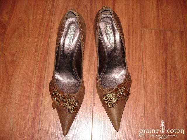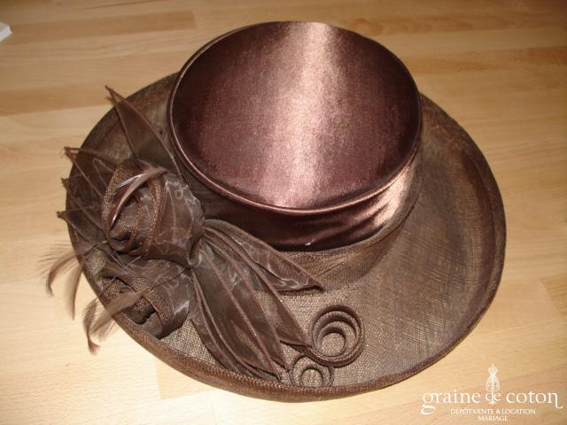 Chapeau en satin et toile de jute chocolat. Fleurs, pétales en organza assortie et plumes décorent le chapeau.