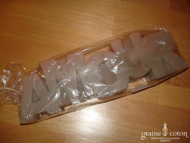 Grosse bougie couleur chocolat formant le mot « AMOUR ». 5 mèches. Dimensions : l25*h8*L5,5 cm