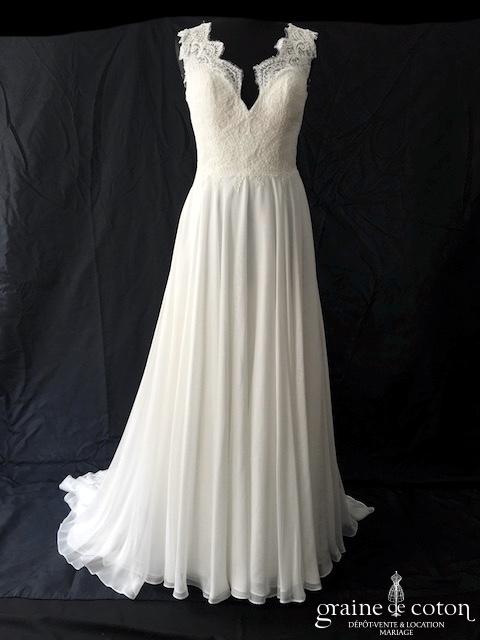 Robe une pièce ivoire clair : top en dentelle avec larges bretelles, décolleté en V et dos nu en V également. Jupe taille haute en mousseline fluide, légèrement évasée avec …