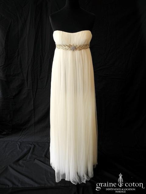 Robe une pièce ivoire clair : top bateau en dentelle, encolure coeur, dos boutonné. Jupe taille haute princesse en tulle fluide pour un volume en toute simplicité. Longue traîne. Somptueuse …