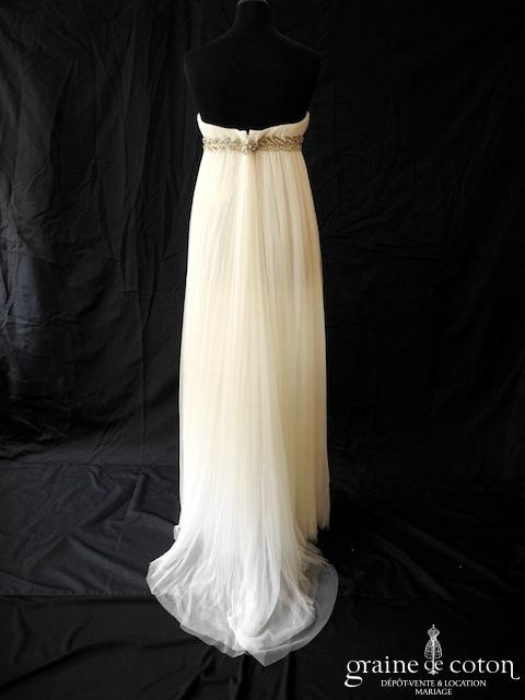 Robe une pièce ivoire clair : top en dentelle avec décolleté V plongeant et dos boutonné, bretelles effet manchettes. Jupe princesse taille haute en soft tulle épuré, très longue traîne. …