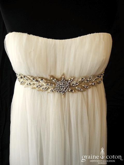 Robe une pièce nude en tulle pailleté : bustier drapé recouvert de dentelle, avec encolure bateau amovible. Jupe taille haute fluide épurée avec petite traîne. Lumineuse et seyante.