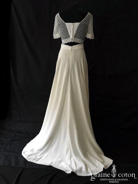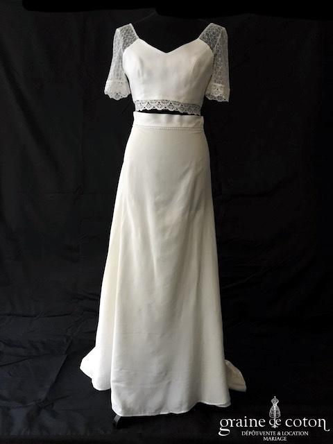 Robe une pièce ivoire clair : top encolure américaine en dentelle rebrodée de perles. Jupe taille haute en crêpe épuré fluide, légèrement évasé, avec longue traîne. Élégante, classe et lumineuse. …