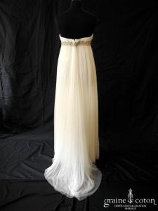 Robe une pièce ivoire clair : décolleté V et dos nu en dentelle délicatement perlée. Jupe taille haute tout en tulle avec rappel de dentelle, beau volume tout en légèreté, …