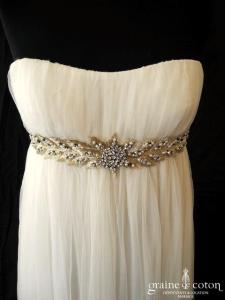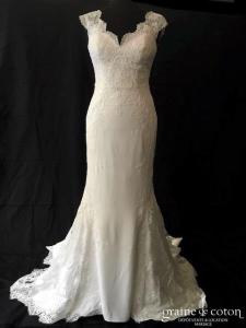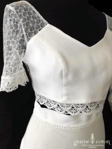 Robe une pièce ivoire clair : bustier droit en dentelle recouvert d’un boléro amovible en dentelle de Chantilly délicatement perlé, manches 3/4. Jupe taille haute en soft tulle fluide et …