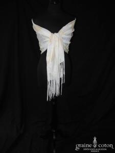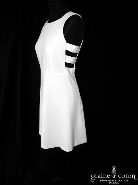 Robe une pièce en crêpe ivoire clair : bustier avec larges bretelles et bandes façon noeud, ouverts, sur les côtés. Jupe courte très légèrement évasée. Chic et sobre, idéale pour …