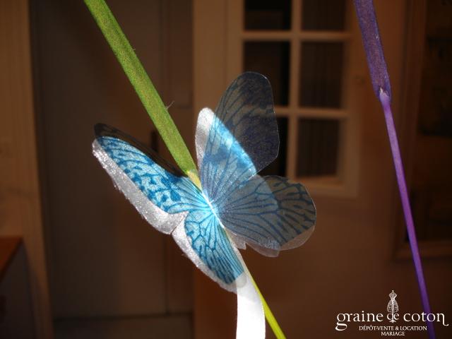 Papillon en papier transparent rigide coloré et organza blanc. A l’aide d’un ruban de satin, il se noue partout : verre à pied, marque place, couvert, serviettes ou en décoration …