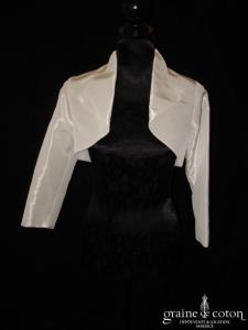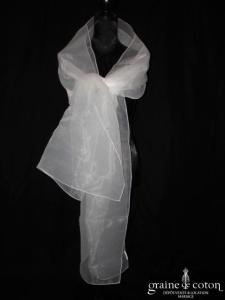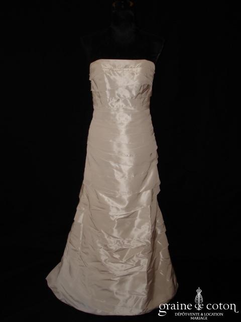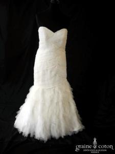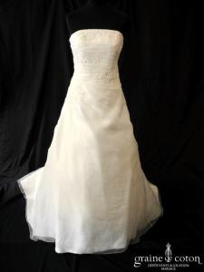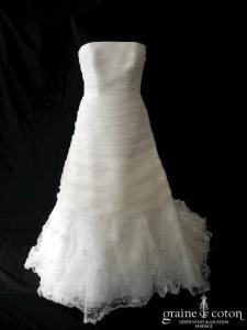 Robe une pièce en organza ivoire clair doublé de satin : bustier drapé avec application de dentelles délicatement perlée. Jupe trapèze légèrement évasée avec traîne. Légère et lumineuse.