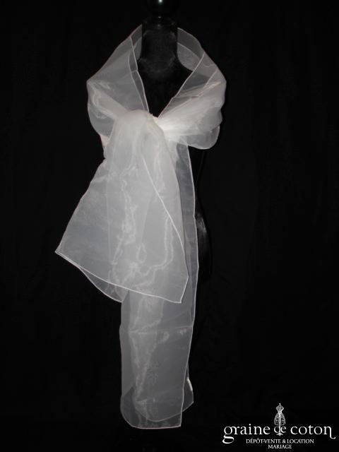 Robe une pièce ivoire clair en organza : bustier composé de larges plis horizontaux, tout en simplicité. Jupe trapèze évasée s’ouvrant sur un pan en tulle recousu de fleurs en …