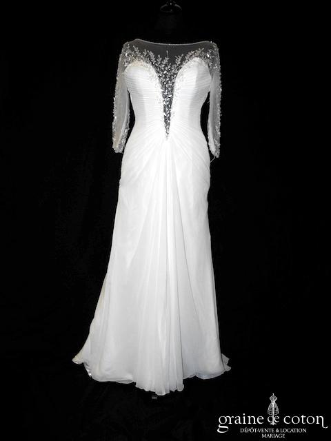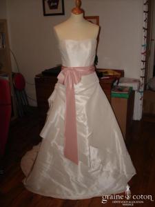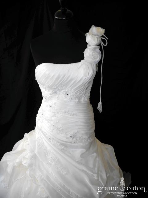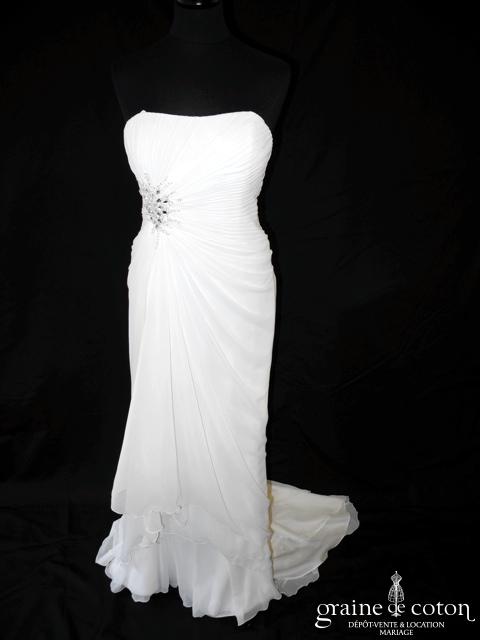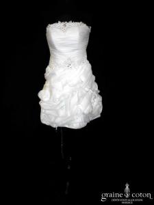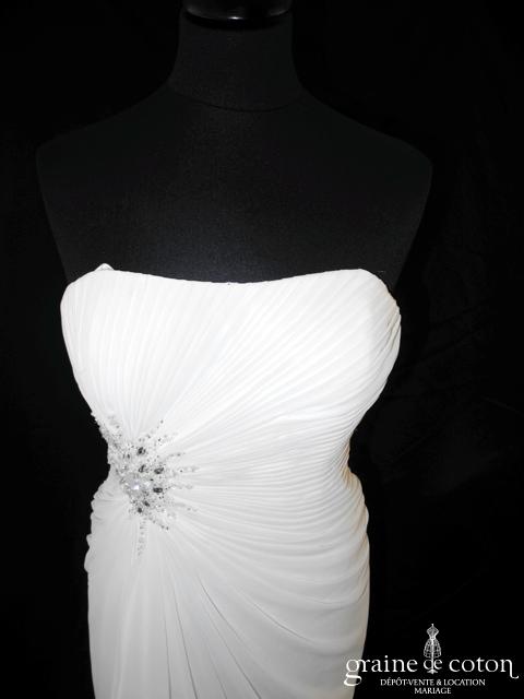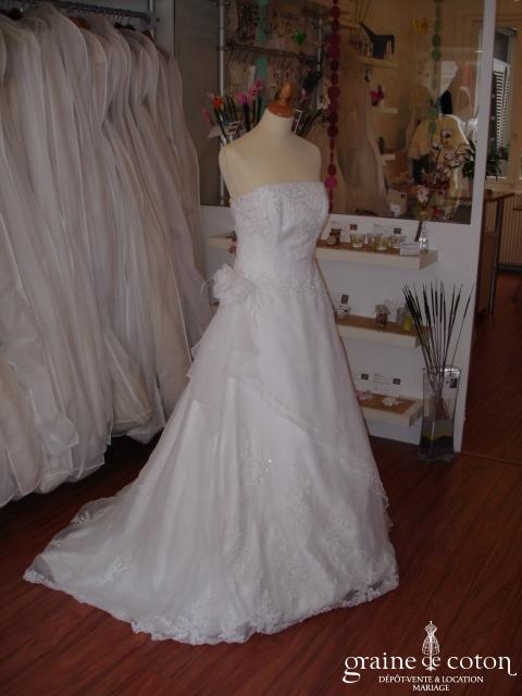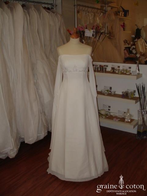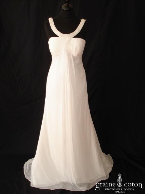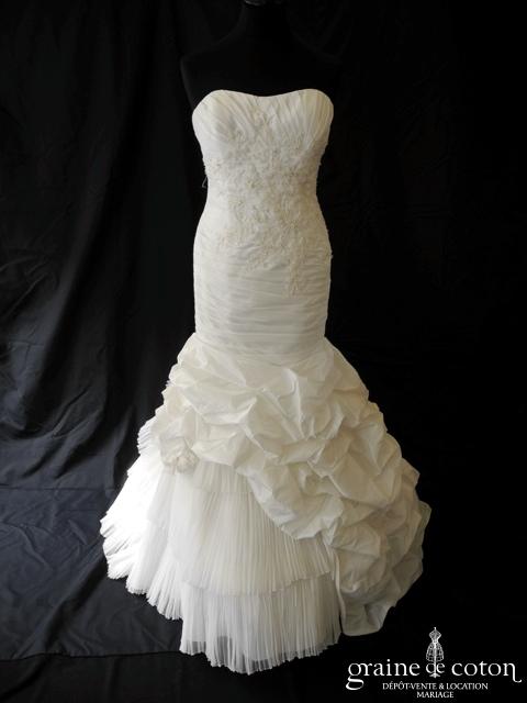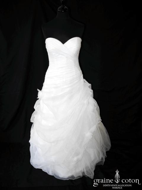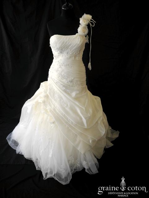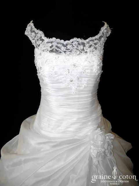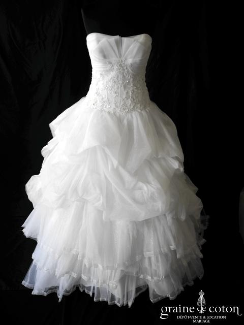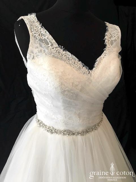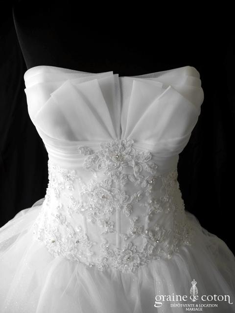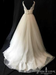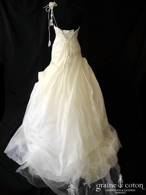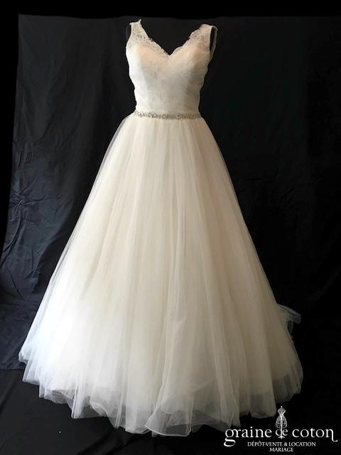 Robe une pièce ivoire clair : bustier V avec bretelles, drapé de dentelle et ceinture de strass marquant la taille haute, dos nu. Jupe en tulle fluide largement évasée avec …