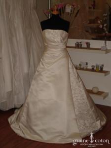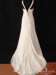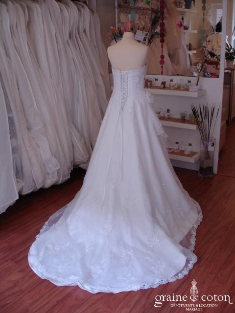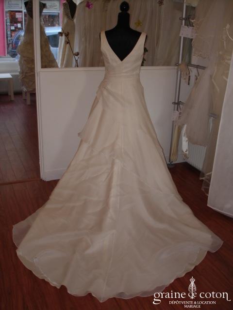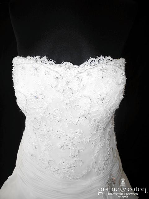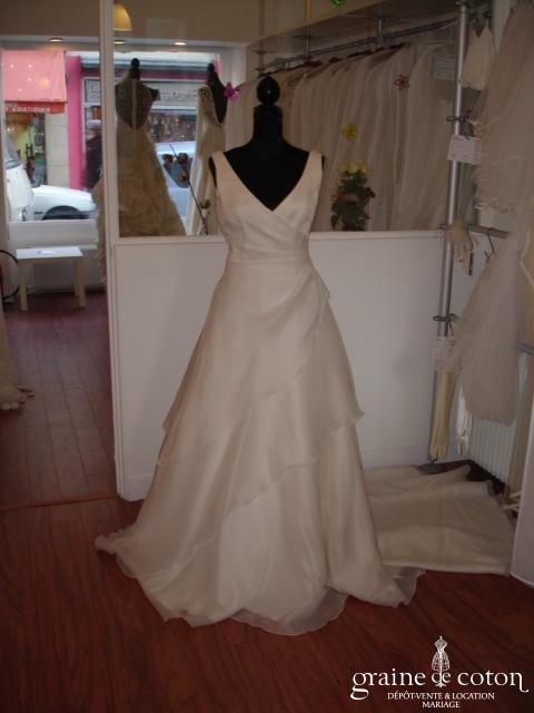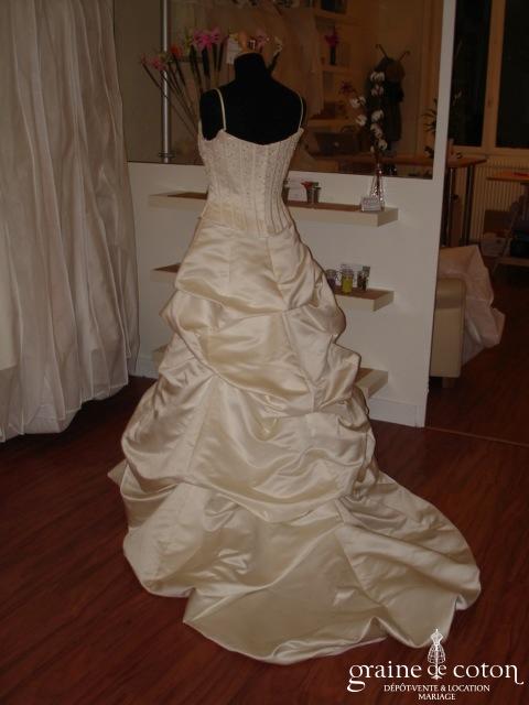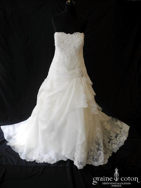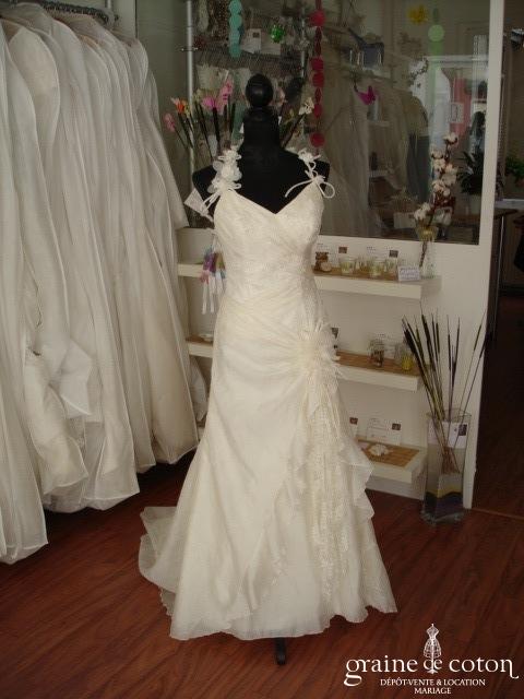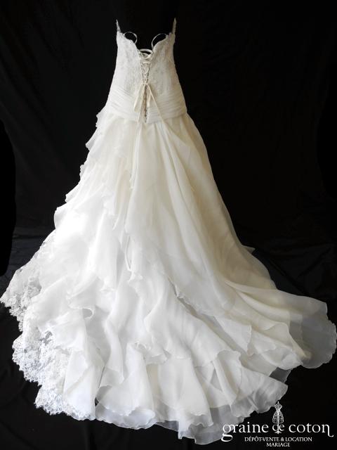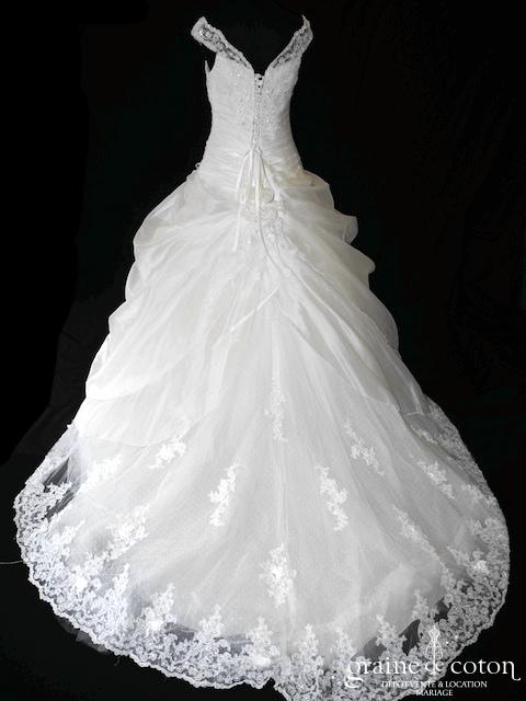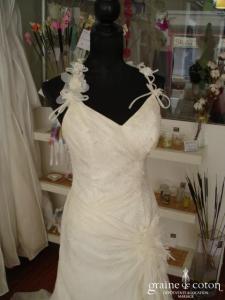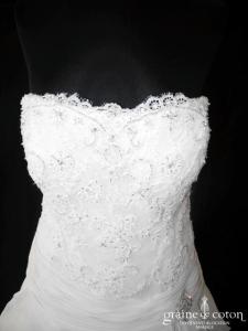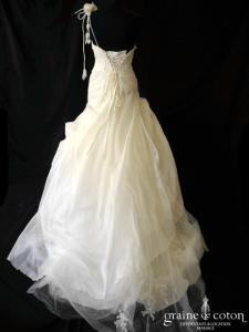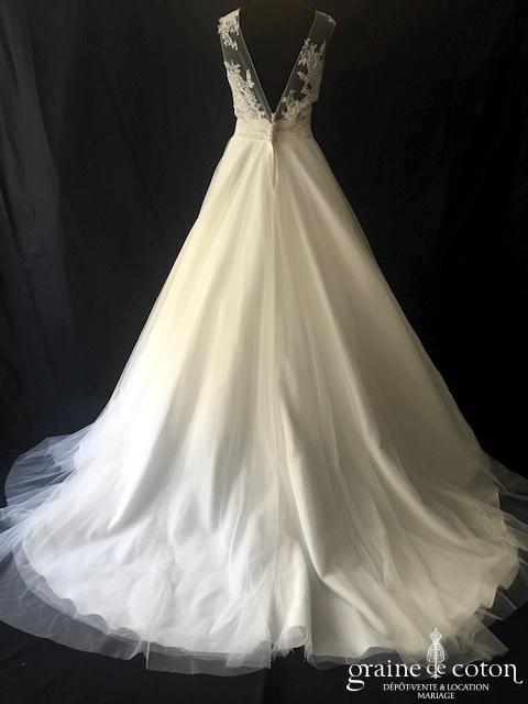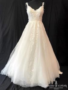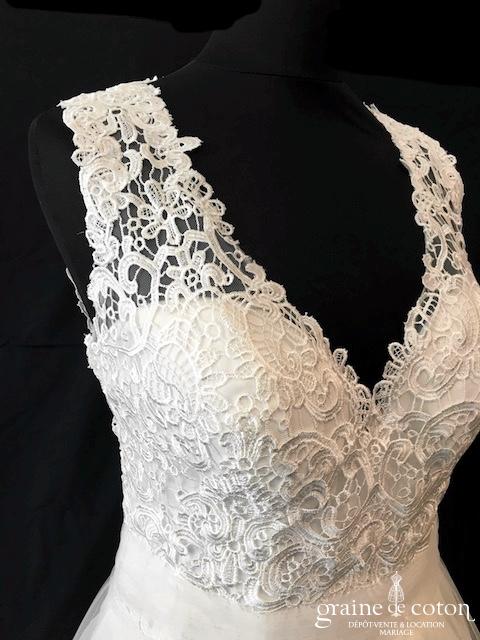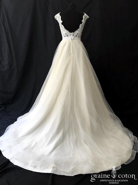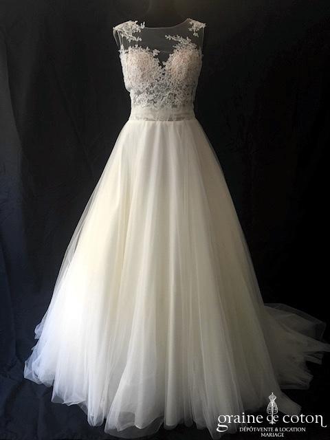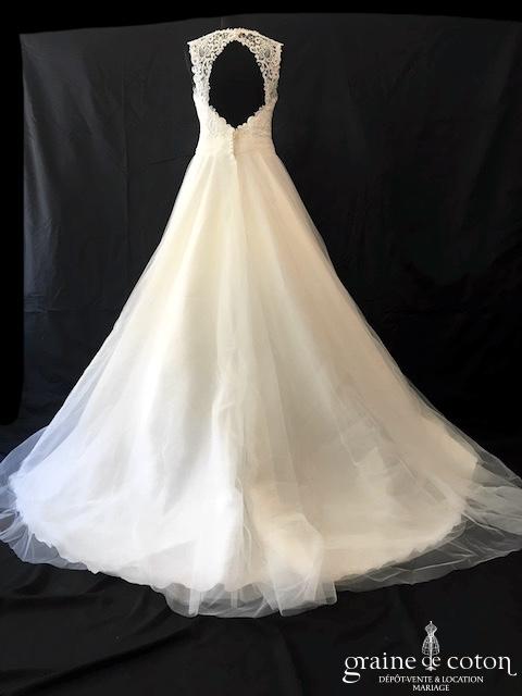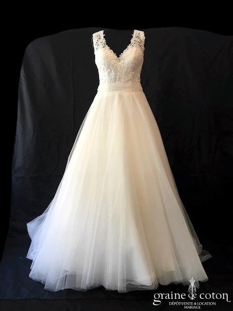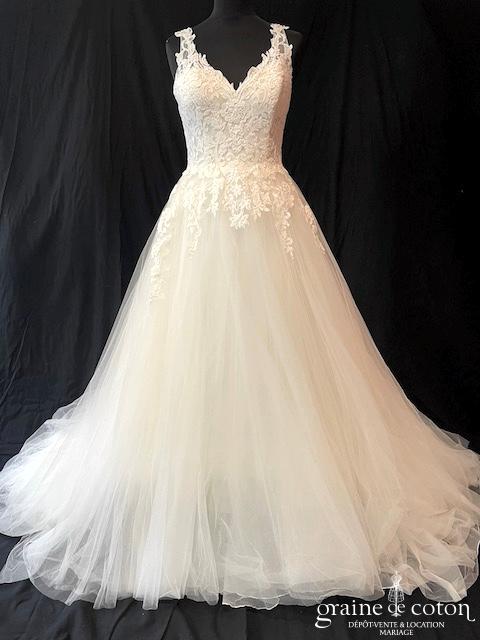 Robe une pièce ivoire clair : bustier en guipure décolleté en V et dos nu, larges bretelles. Jupe taille haute en tulle fluide, largement évasée avec traîne. Lumineuse et seyante. …