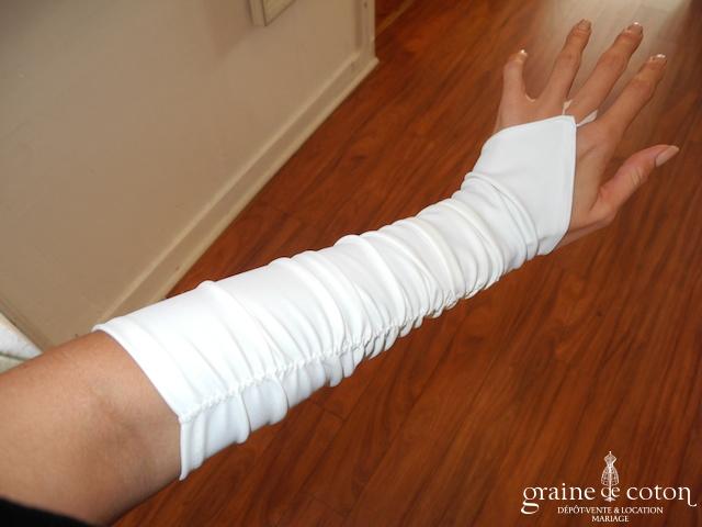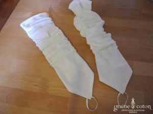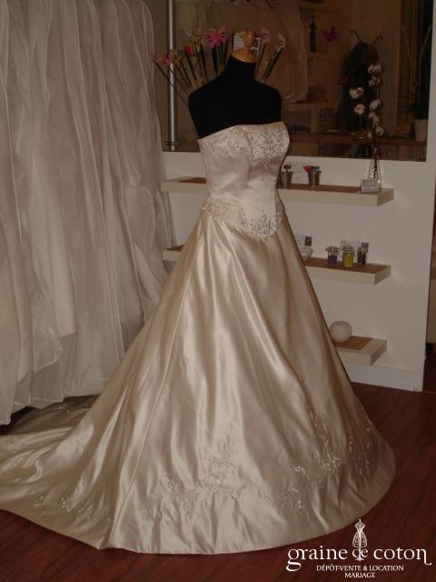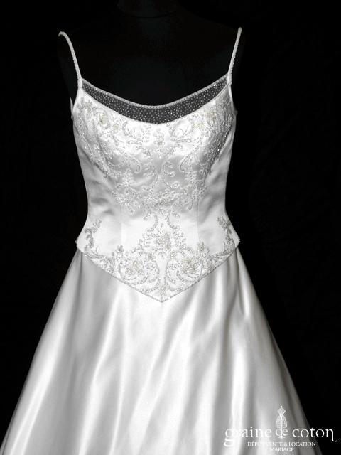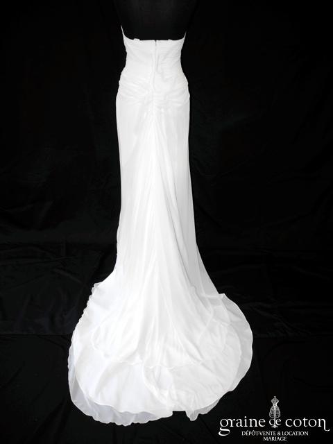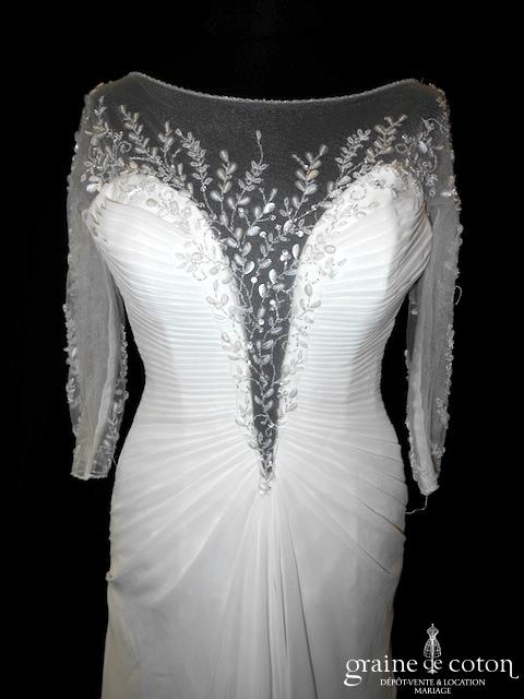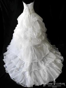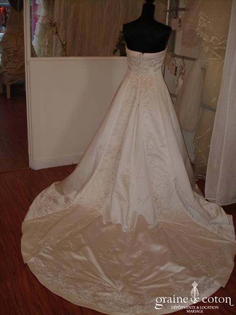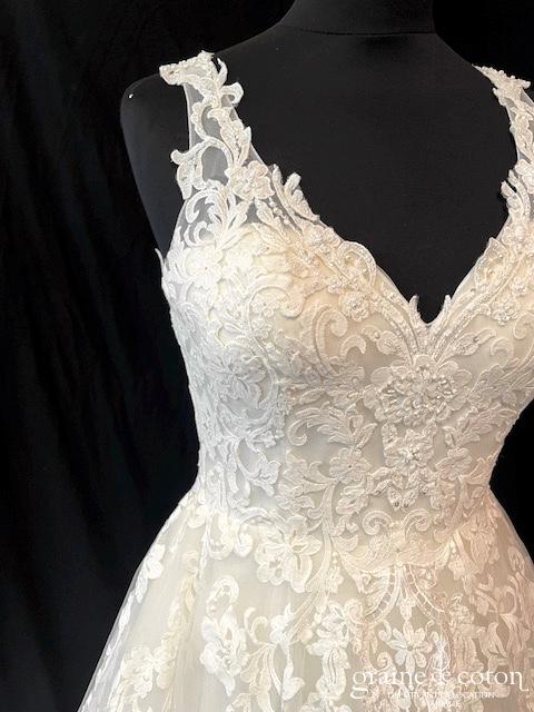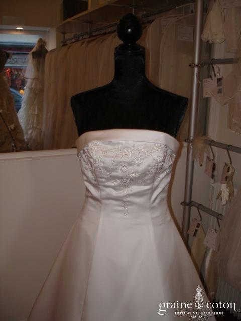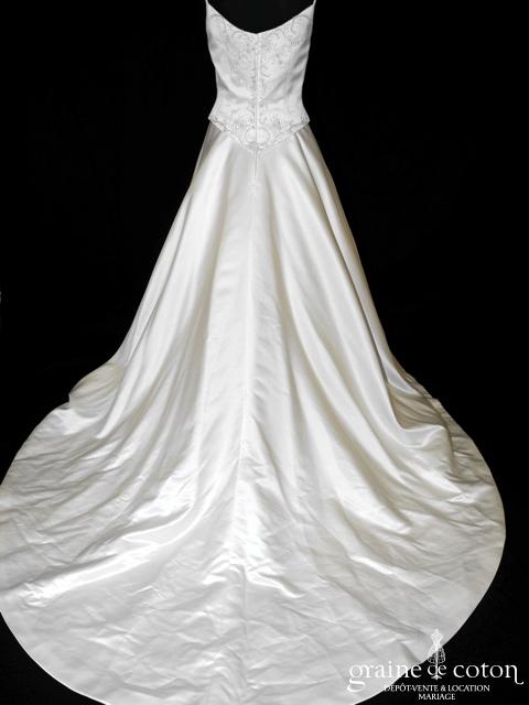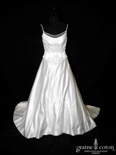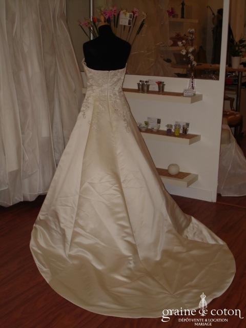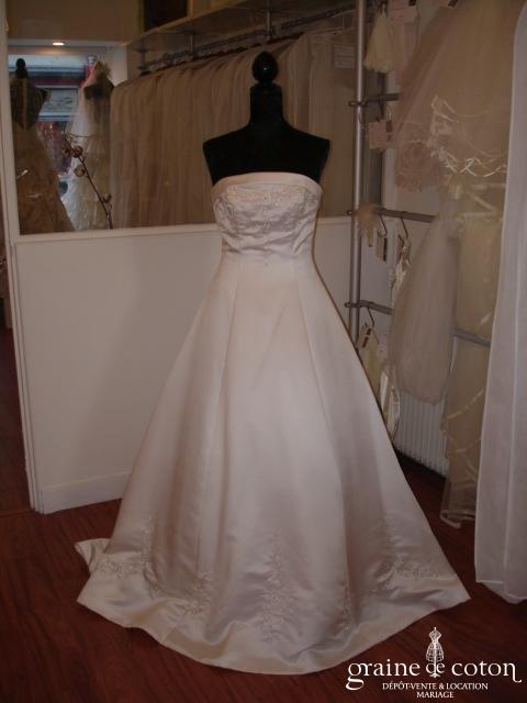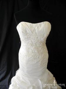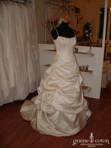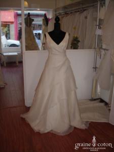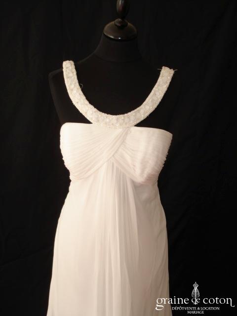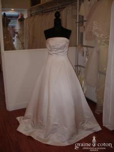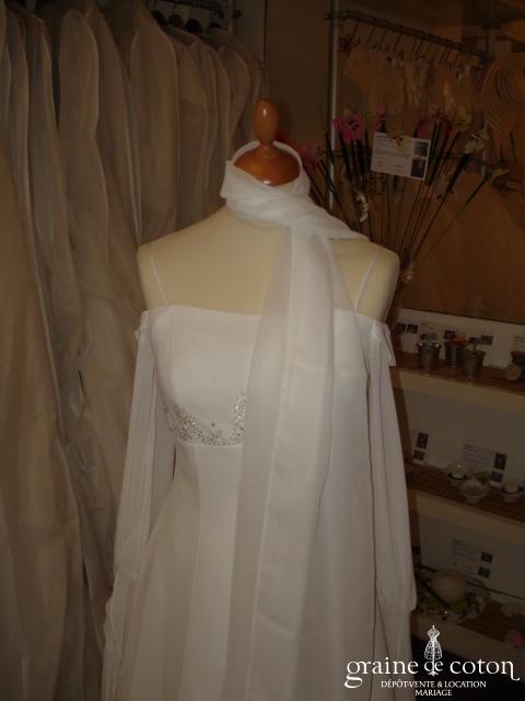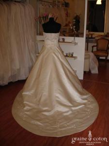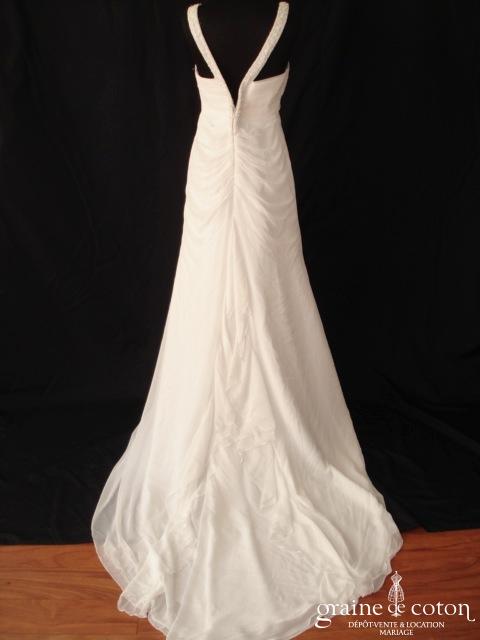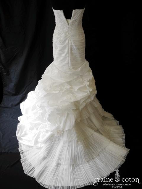 Robe une pièce ivoire clair : bustier en guipure décolleté en V et dos nu, larges bretelles. Jupe taille haute en tulle fluide, largement évasée avec traîne. Lumineuse et seyante. …