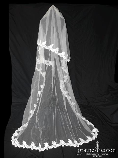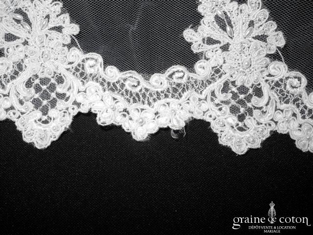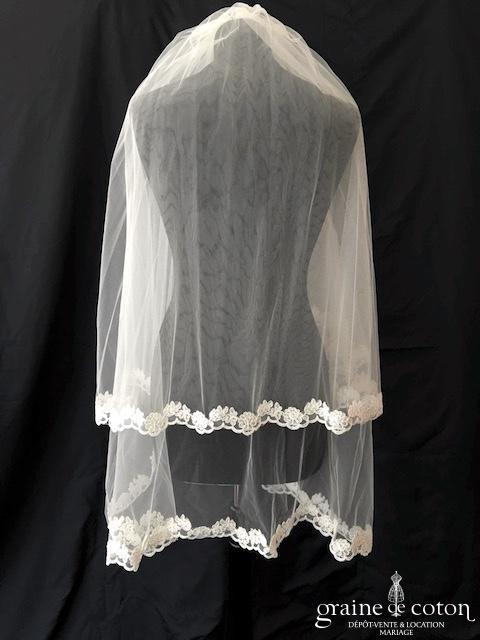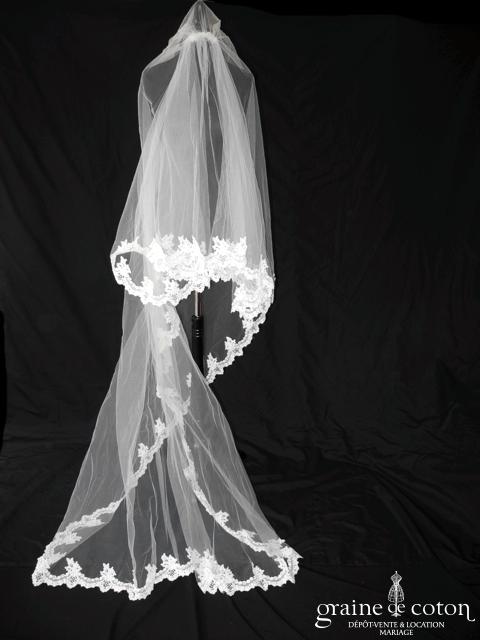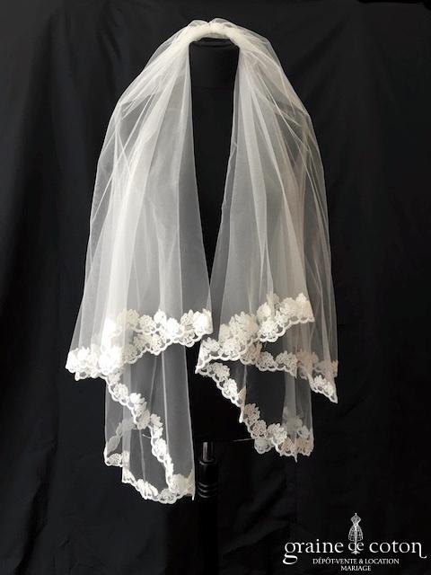 Voile court en tulle ivoire bordé de dentelle. Monté sur peigne, avec rabat.