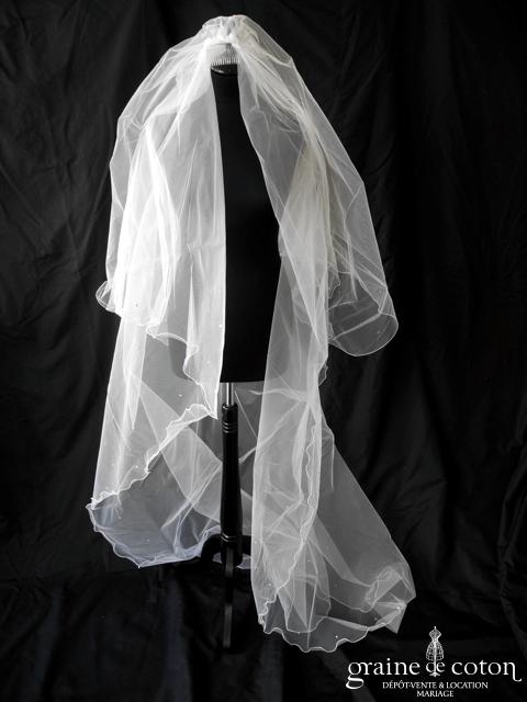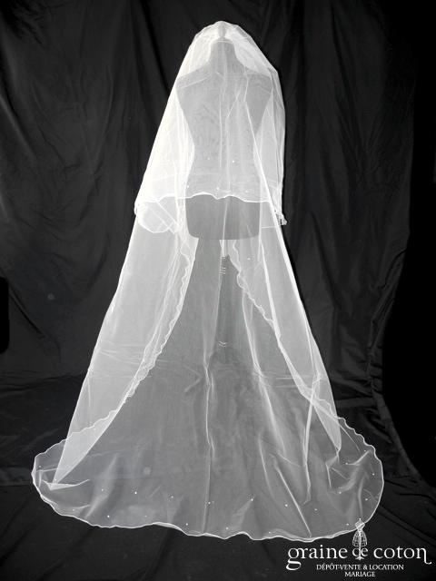 Voile long de 3 mètres en tulle blanc orné de strass. Monté sur peigne, avec rabat avant.