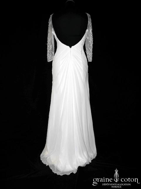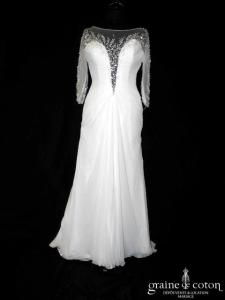 Robe une pièce ivoire clair : top en dentelle pailletée, décolleté en V et dos nu. Jupe taille haute en tulle fluide et léger avec rappel de la dentelle du …