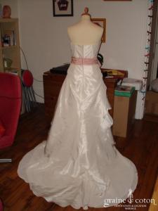 Robe une pièce ivoire clair : top en guipure entièrement boutonné dans le dos avec effet tatouage de la dentelle. Jupe taille haute en tulle fluide, volume et traîne mais …
