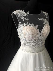 Robe une pièce ivoire clair : top en dentelle avec larges bretelles, décolleté rond et dos nu en V puis boutonné. Jupe taille haute en tulle épuré, largement évasée mais …