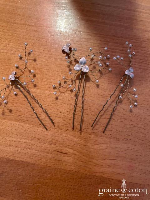Lot de 3 pics à cheveux nacrés sur fil doré. Frais et lumineux.