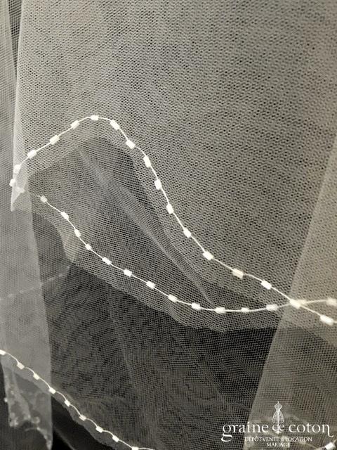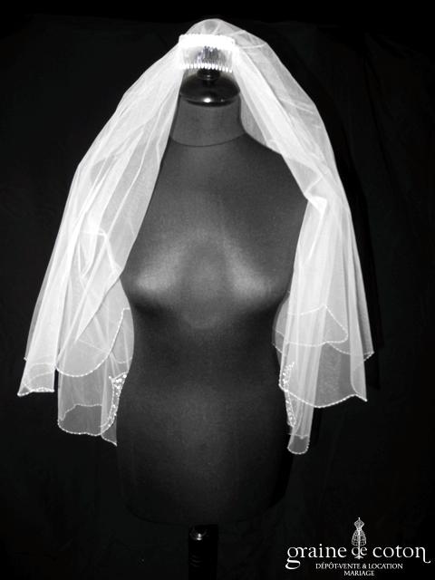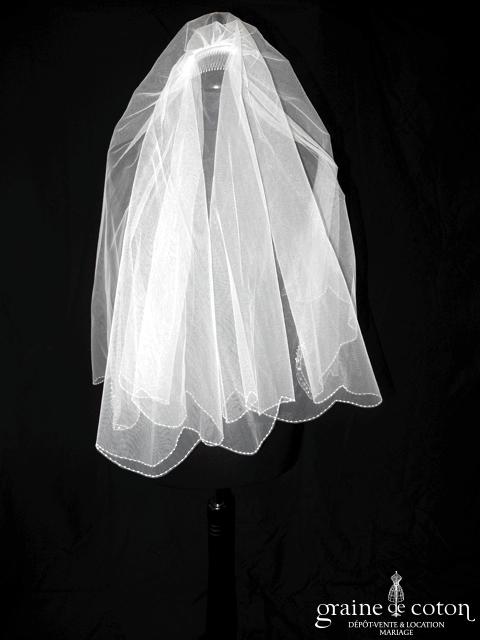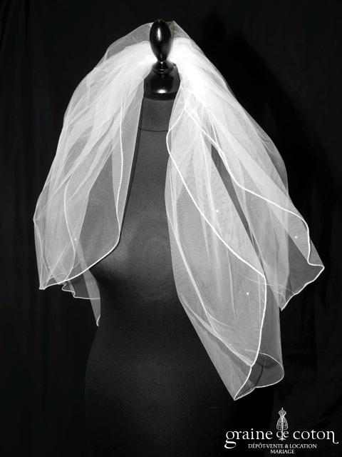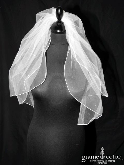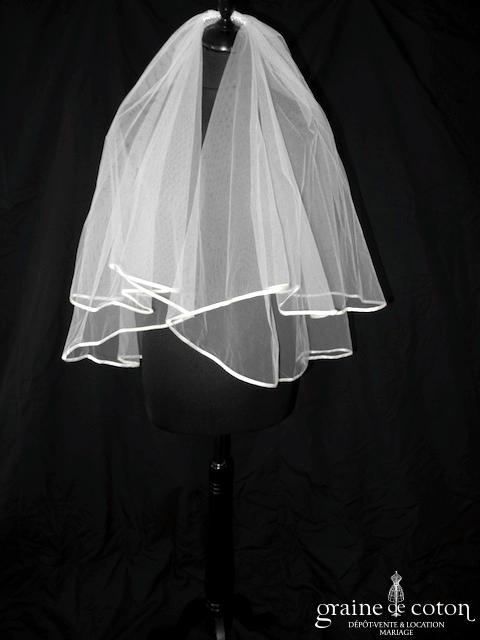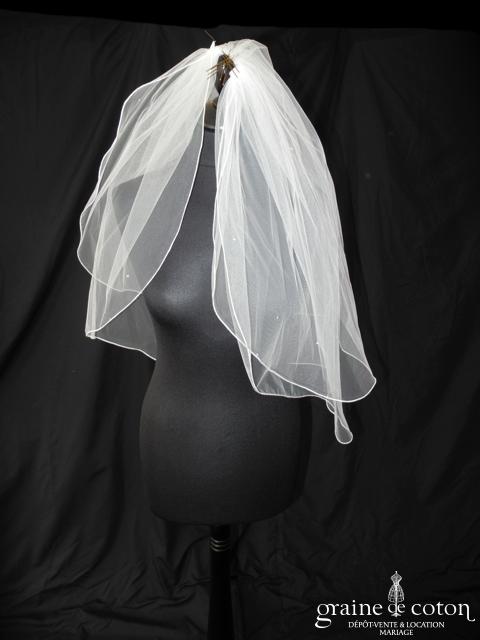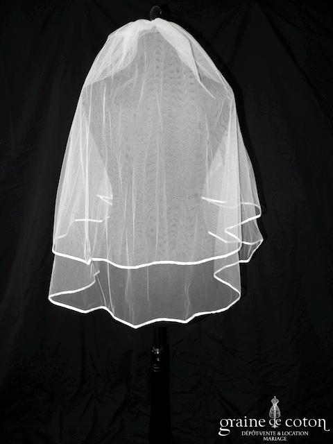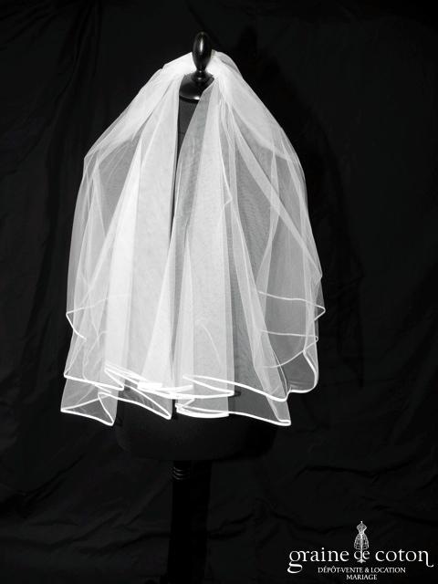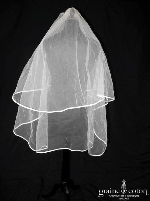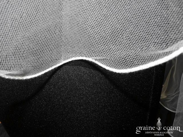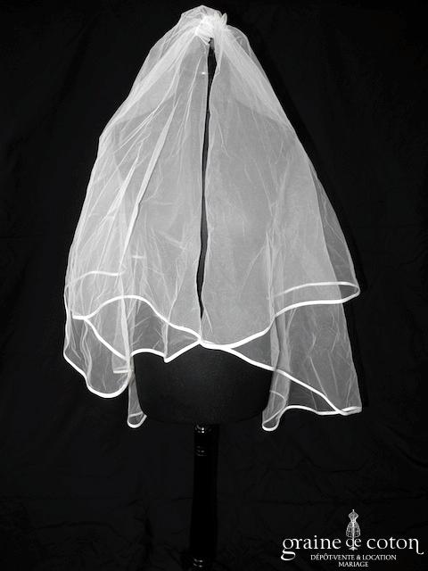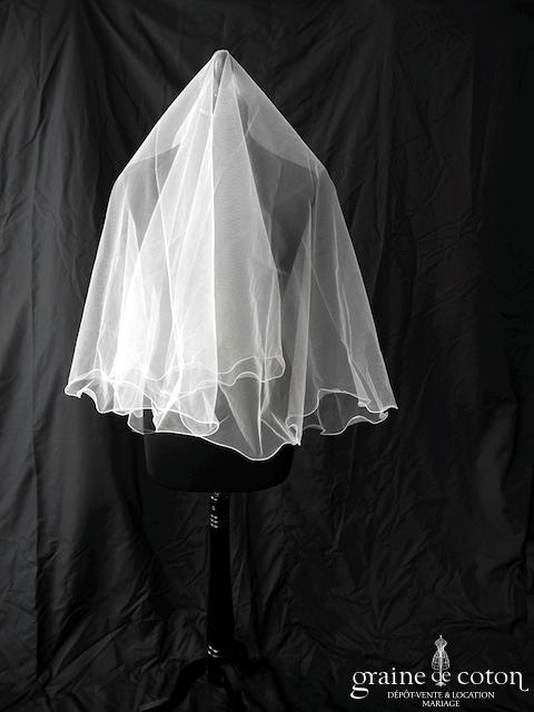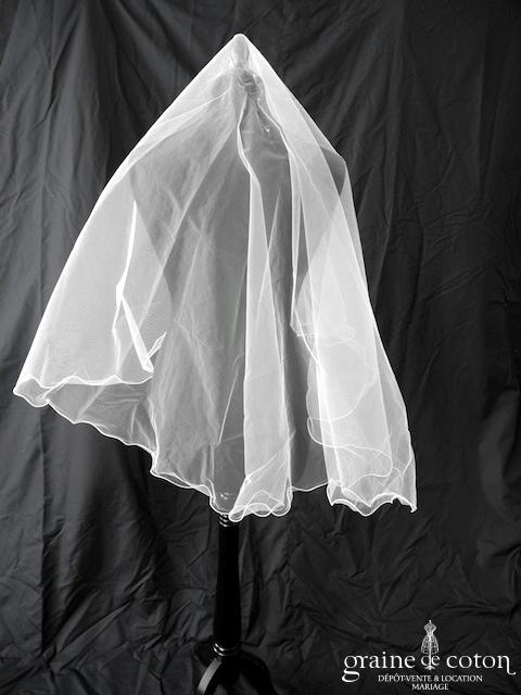 Voile court en tulle blanc bordé d’un biais de satin. Monté sur peigne, avec rabat avant.