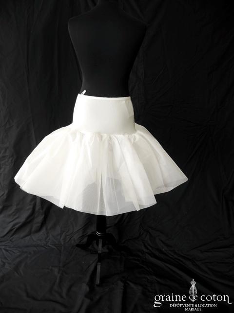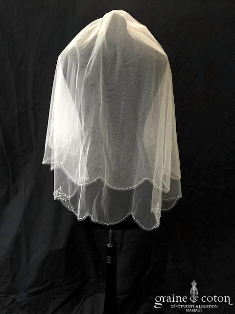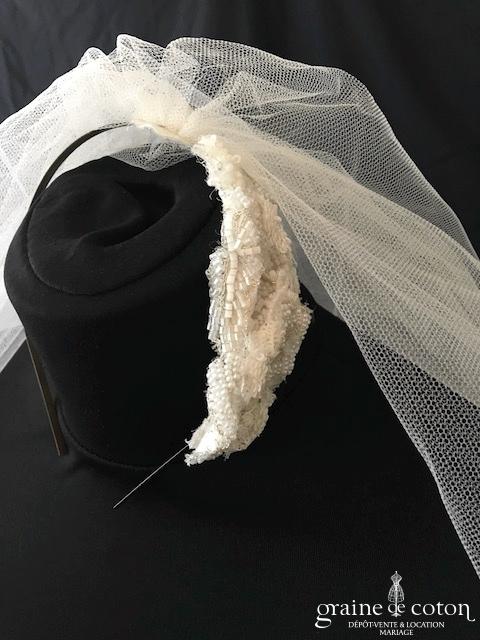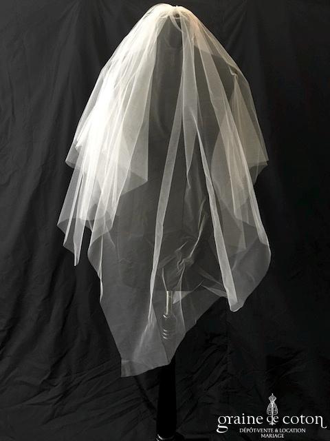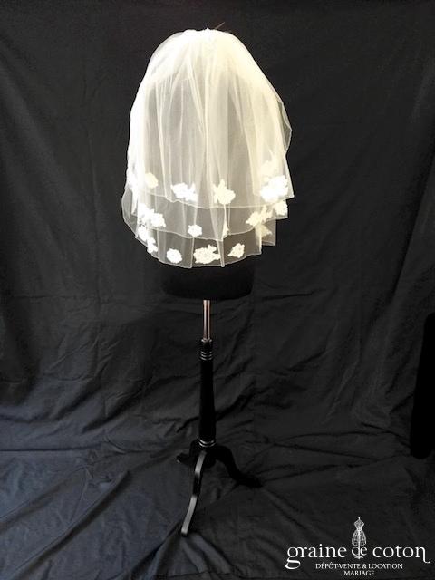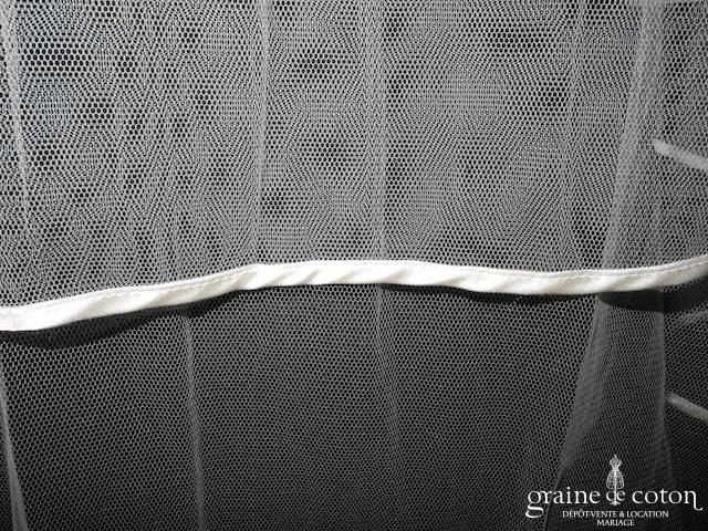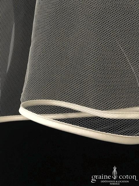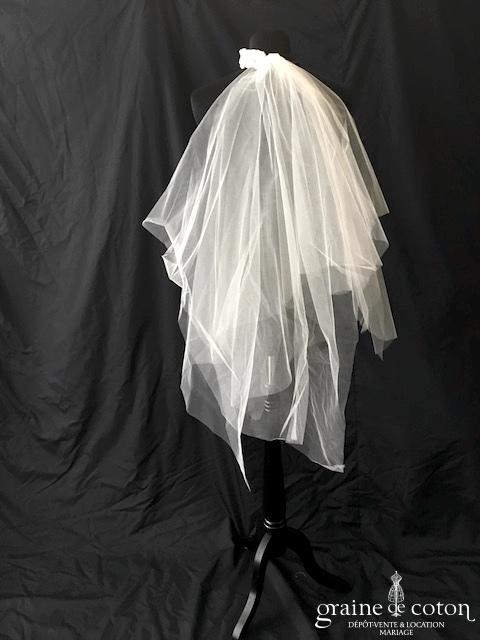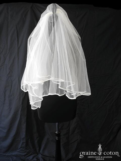 Voile court en tulle ivoire bordé d’un biais de satin. Avec rabat avant, monté sur peigne.
