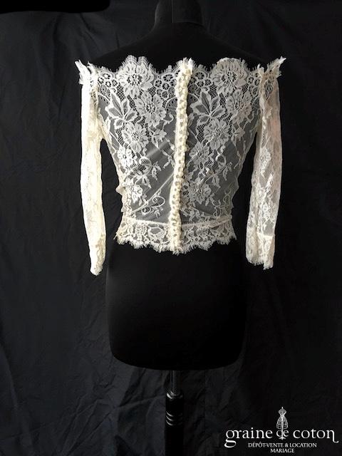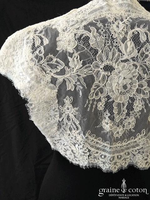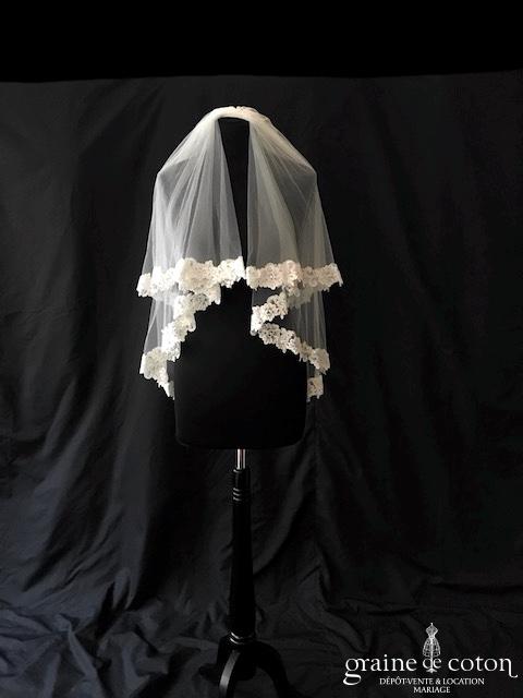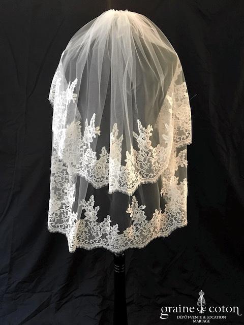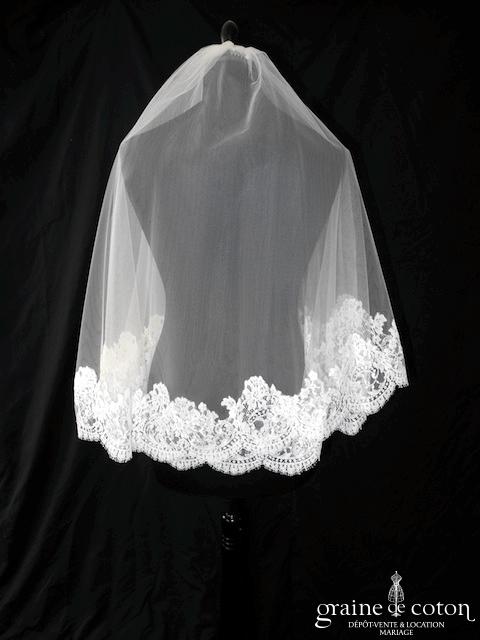 Voile court en tulle ivoire bordé de dentelle. Monté sur peigne, avec rabat avant.