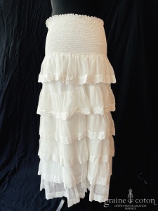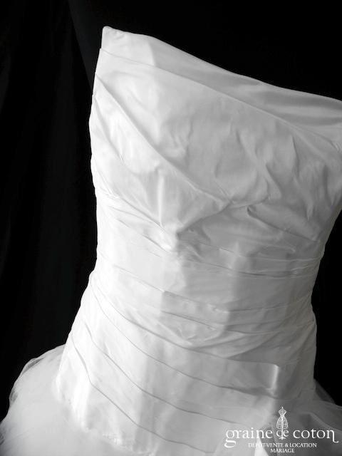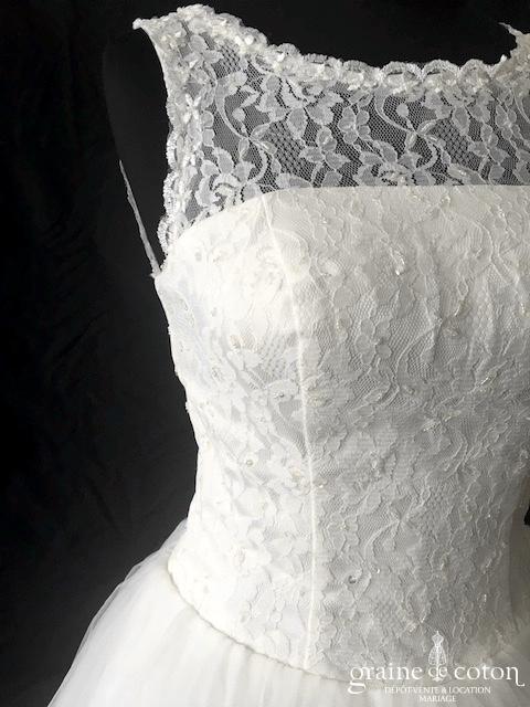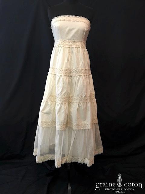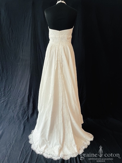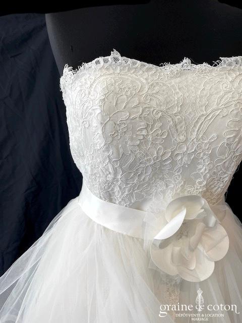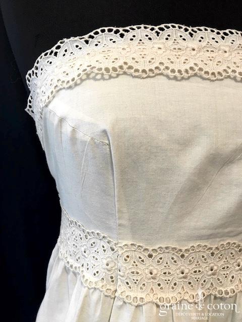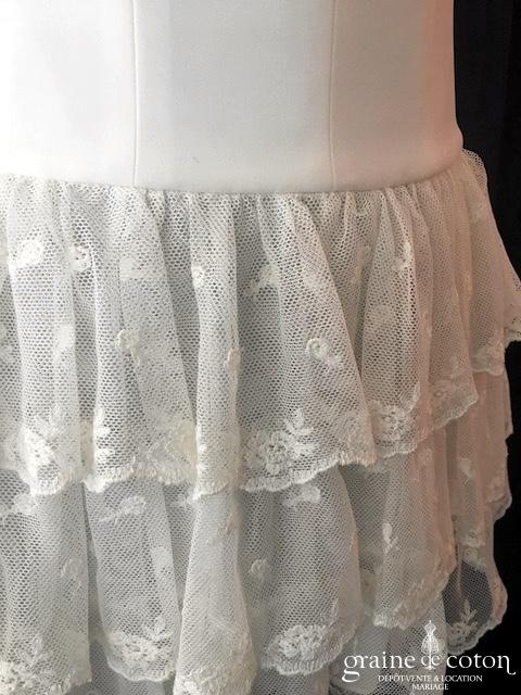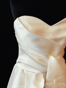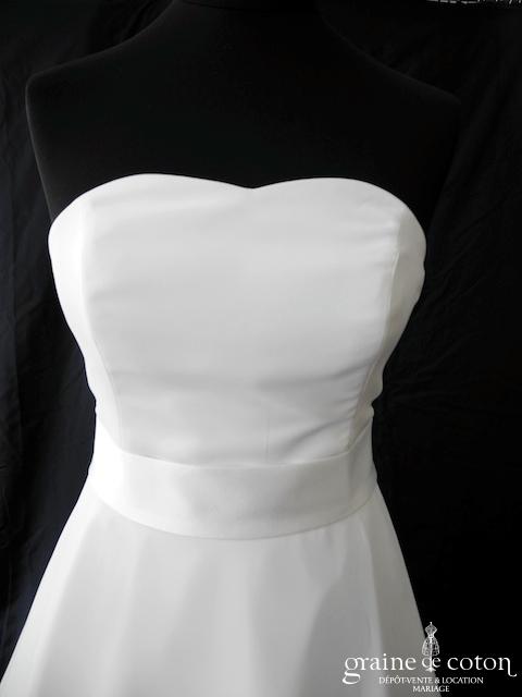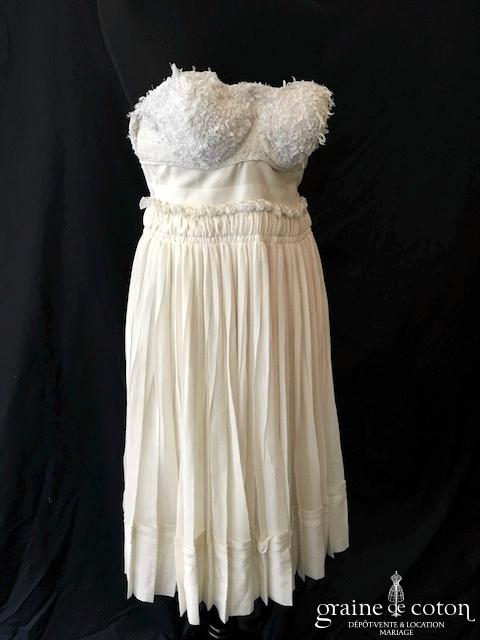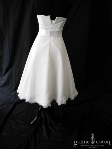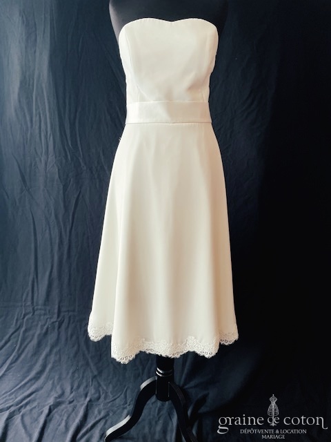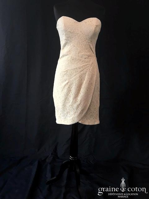 Robe courte au genou droite bustier en dentelle crème, effet drapé. Décolleté forme coeur.