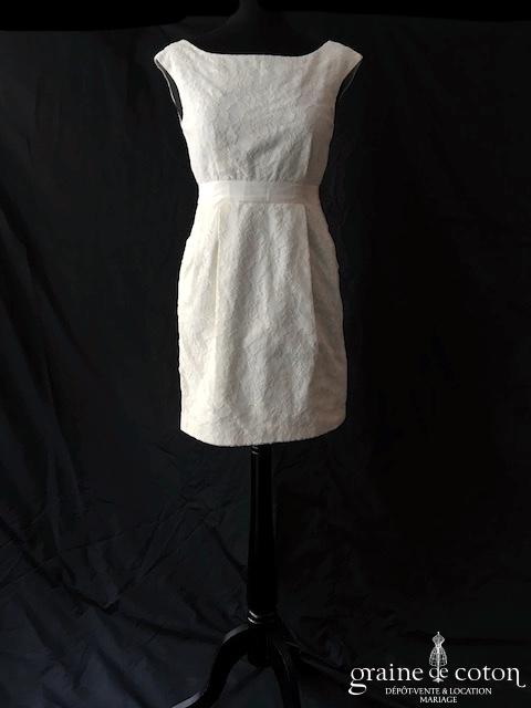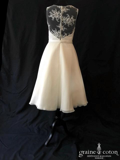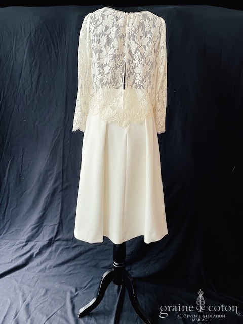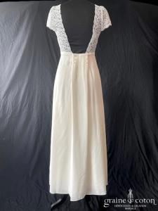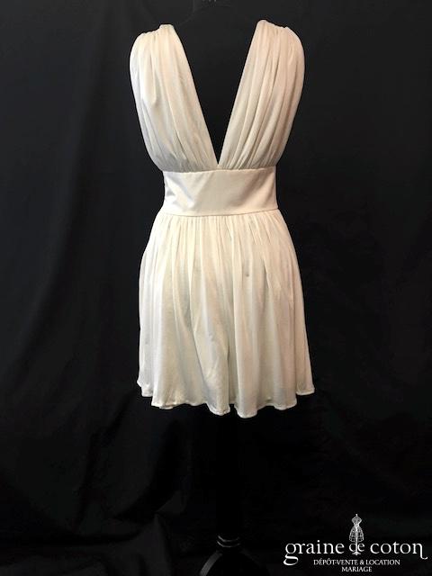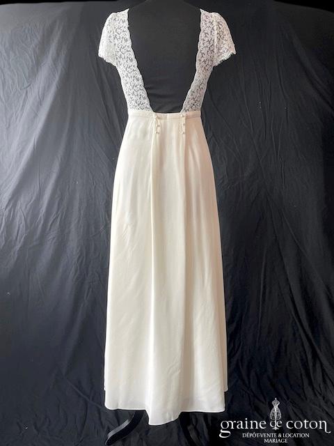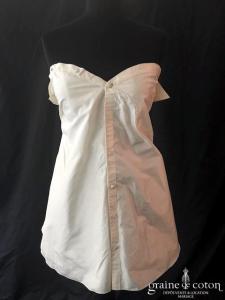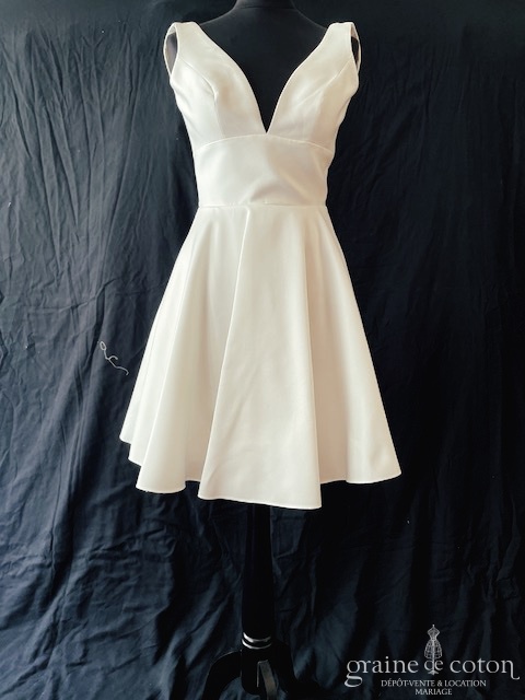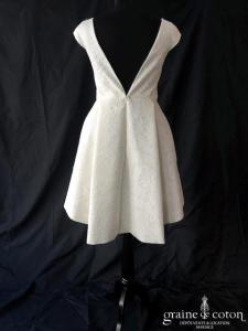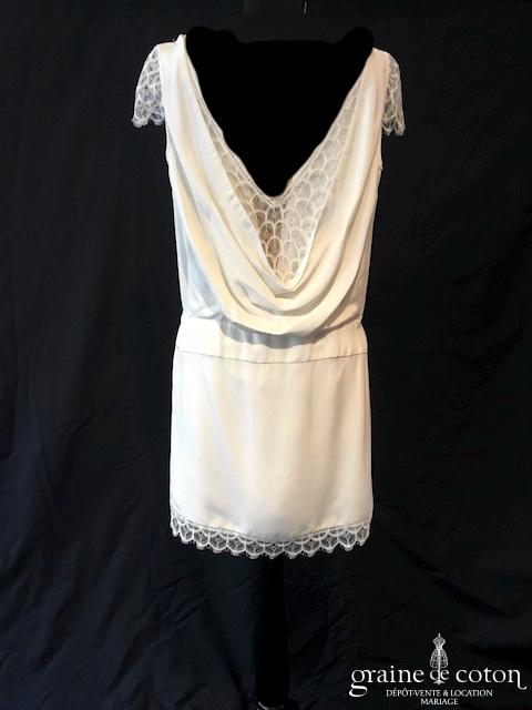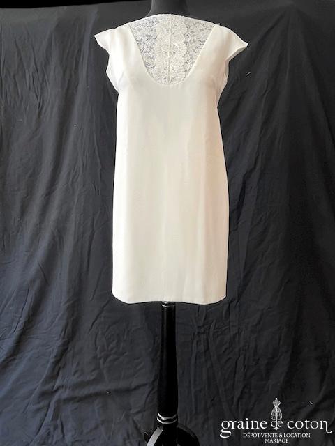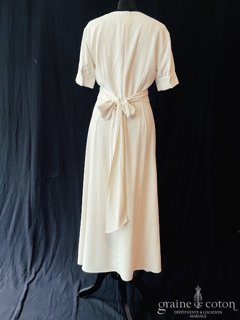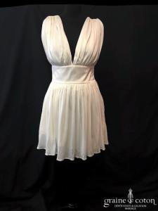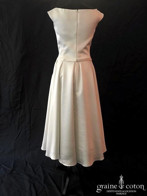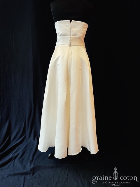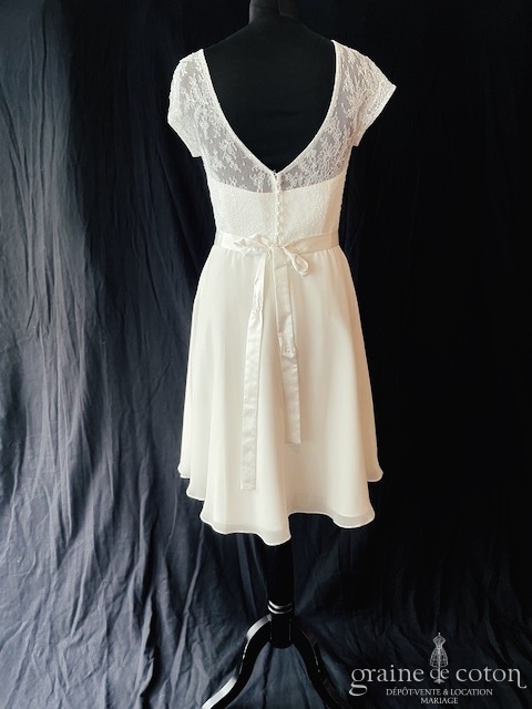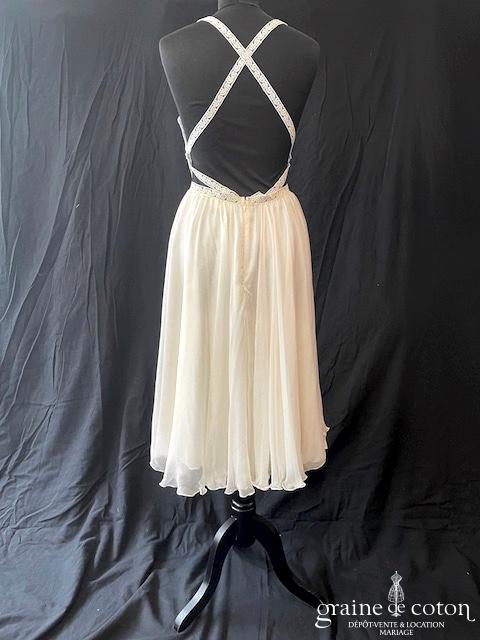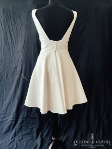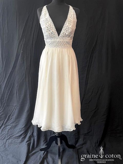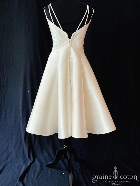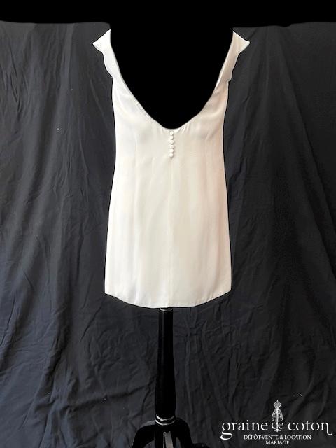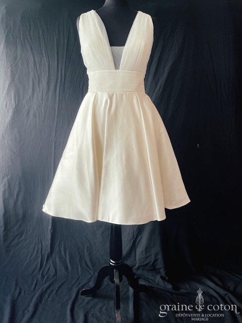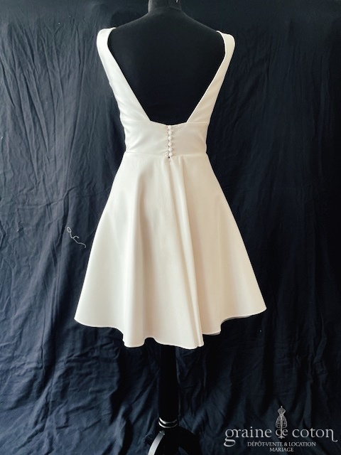 Robe en soie ivoire : encolure américaine et dos nu. Jupe courte au genou. Belle tenue, idéale en 2e tenue civile ou pour la soirée.