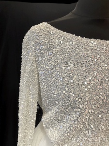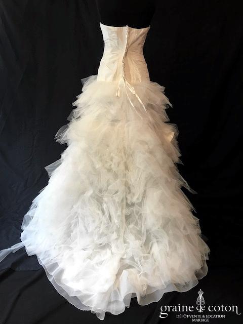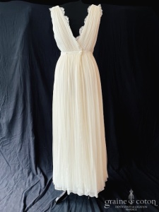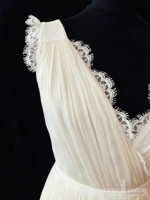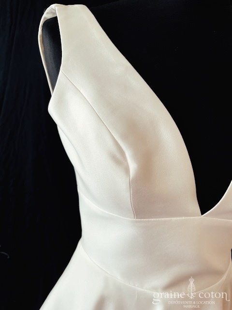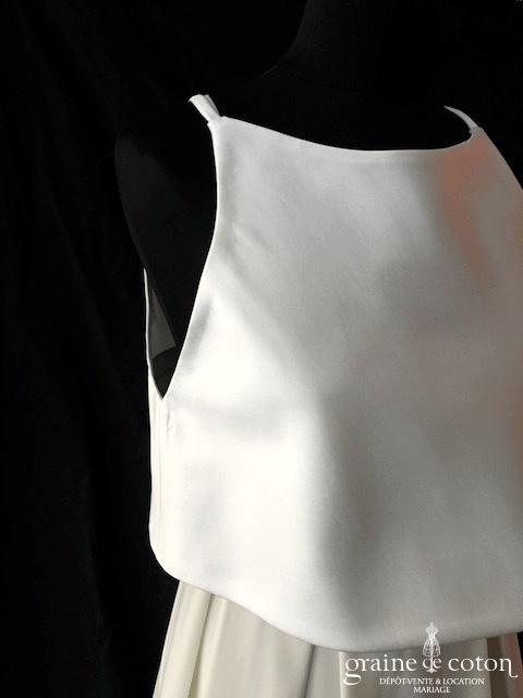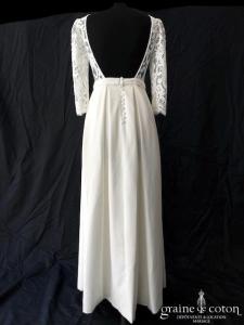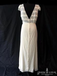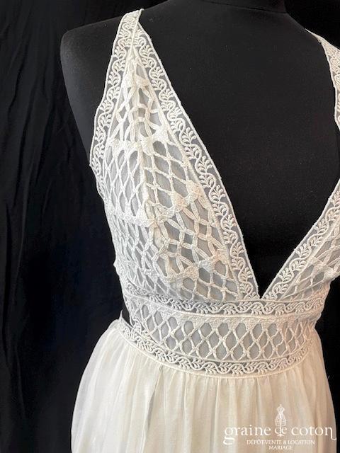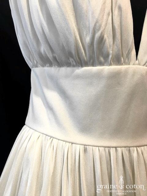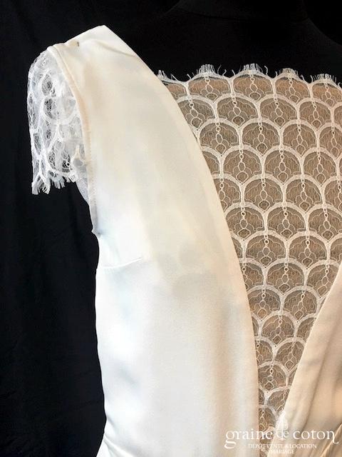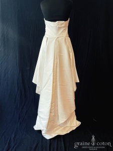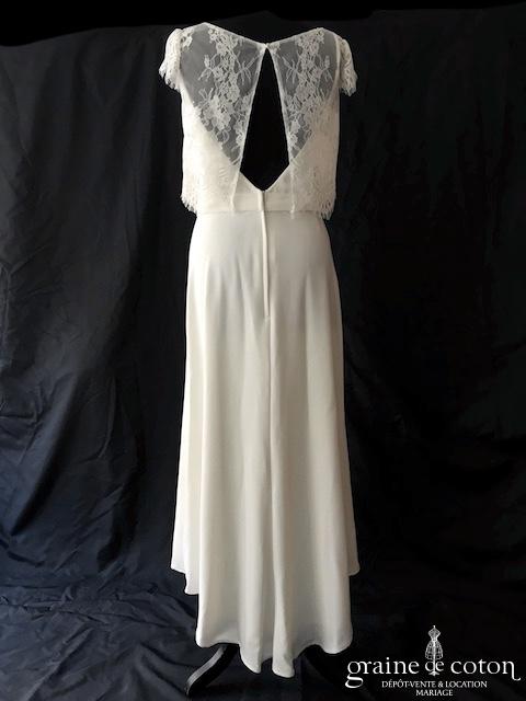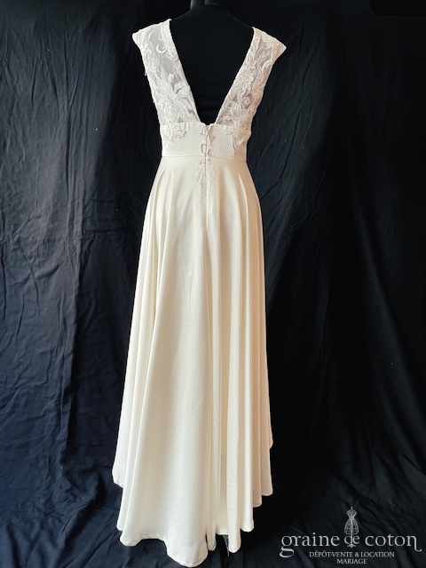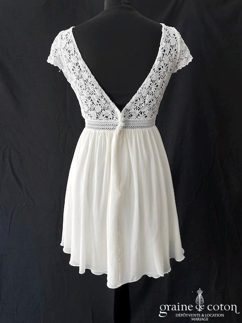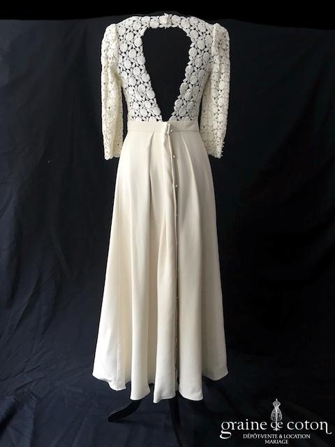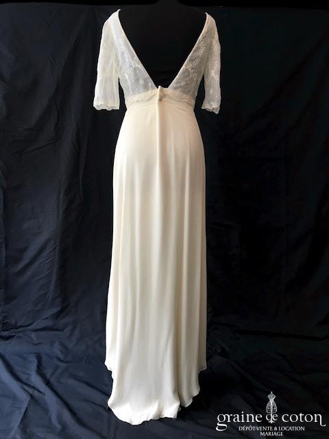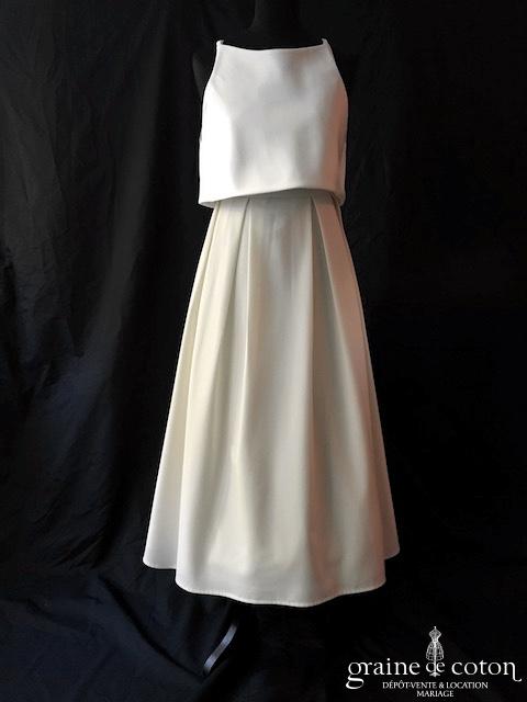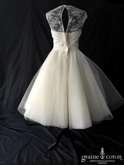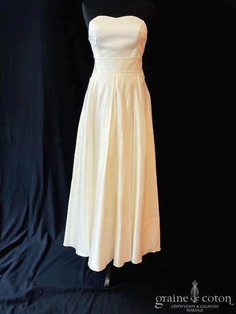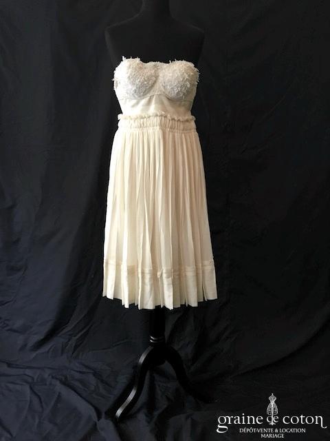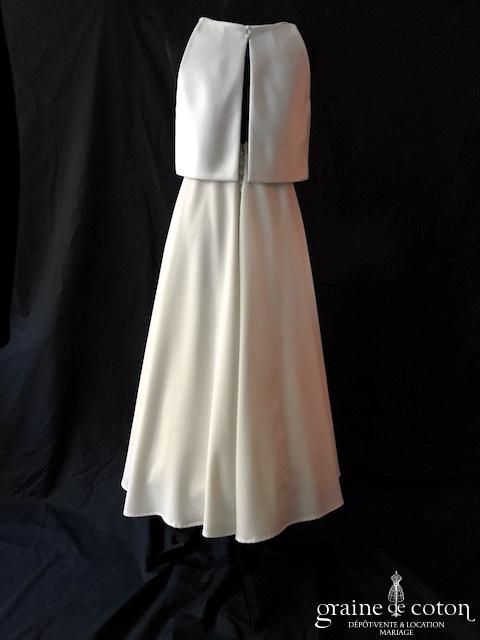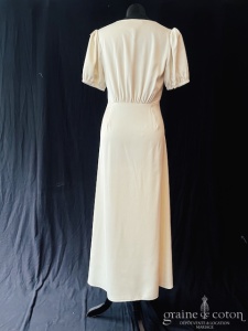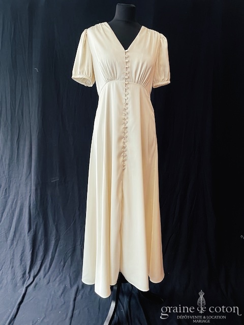 Robe en soie ivoire : encolure américaine et dos nu. Jupe courte au genou. Belle tenue, idéale en 2e tenue civile ou pour la soirée.