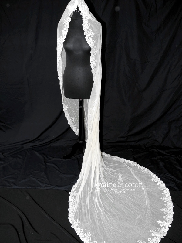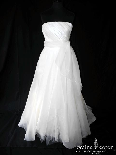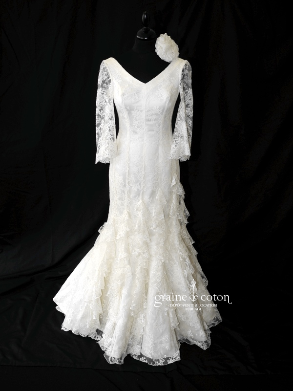 Robe deux pièces en dentelle et organza de soie ivoire : bustier lacé avec manches en fine dentelle, bustier recouvert de dentelle et d’organza de soie. Jupe avec nombreuses couches …
