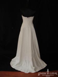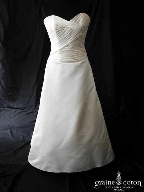 Robe une pièce en satin duchesse ivoire : bustier coeur plissé, taille bien marquée. Jupe épurée en satin avec traîne. Élégante et classe.