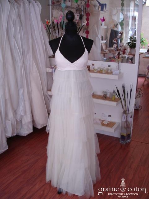 Robe une pièce ivoire taille empire : haut avec triangles recouverts de dentelle et s’attachant par un noeud autour du cou. Jupe à volants de tulle. Légère et originale. Housse …