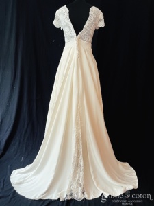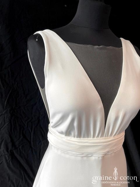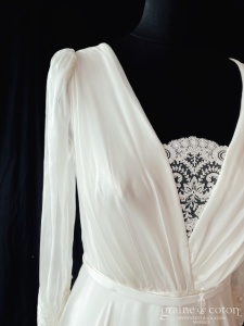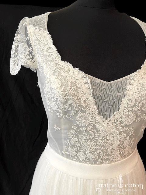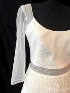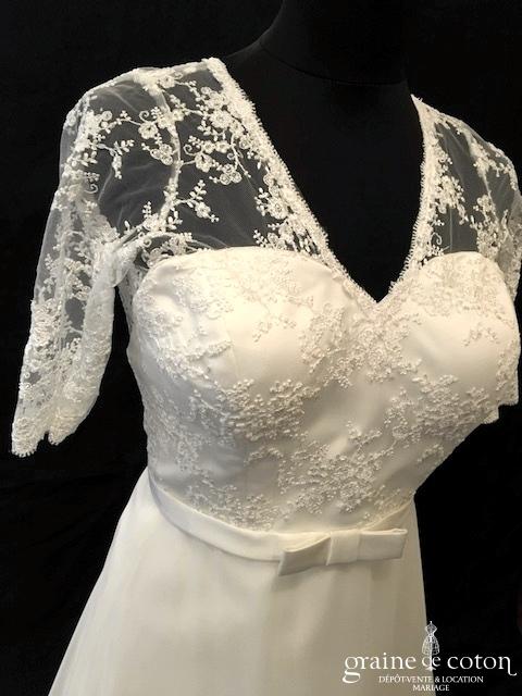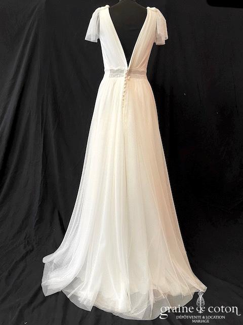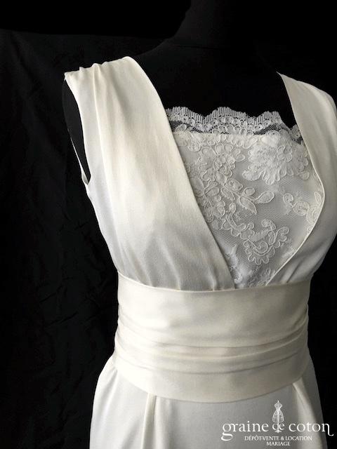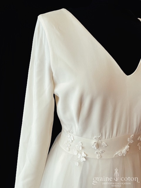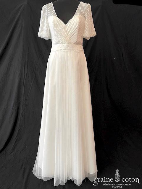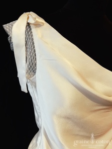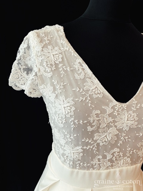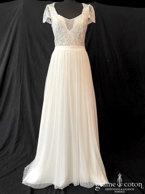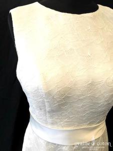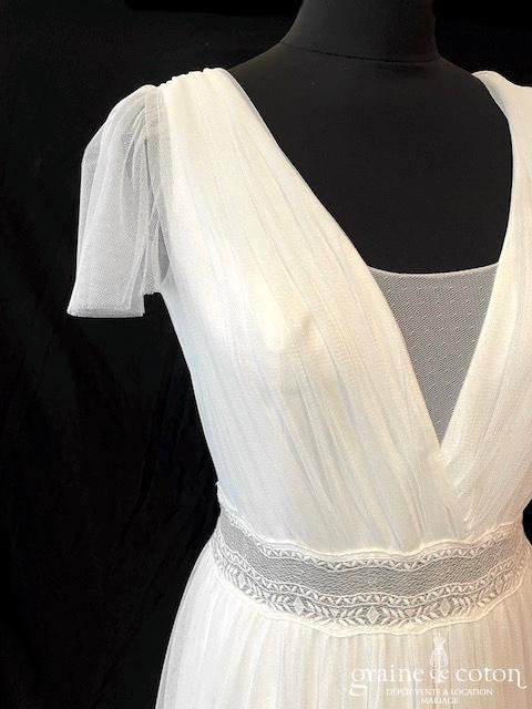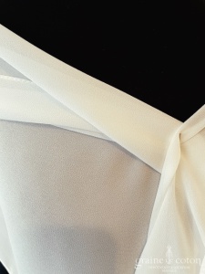 Robe une pièce ivoire clair : top en V drapé de tulle, effet cache coeur. Bretelles avec voile de tulle pour le smanchhes et dos nu. Jupe taille haute marquée …