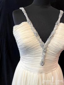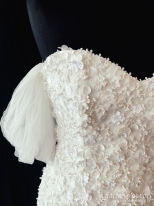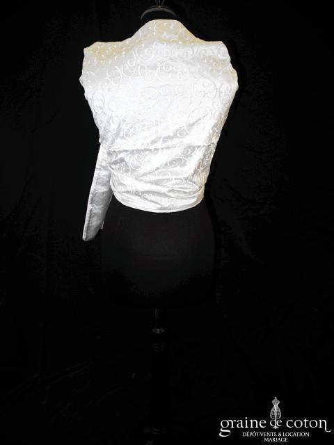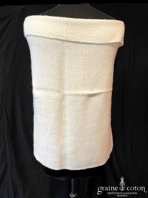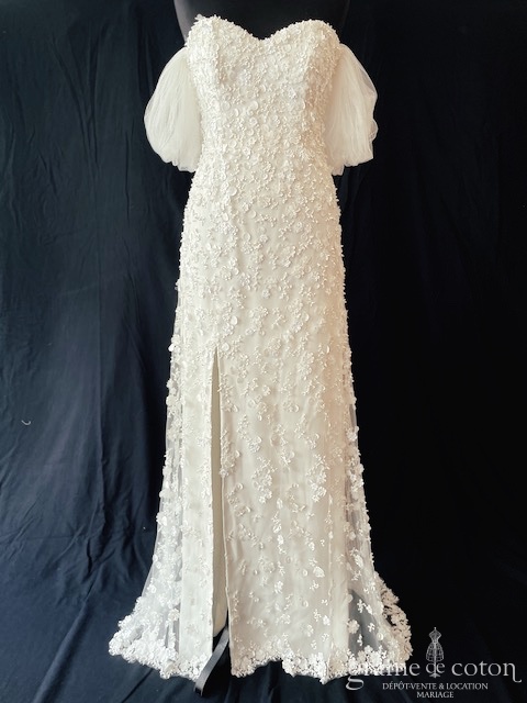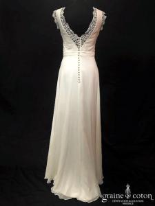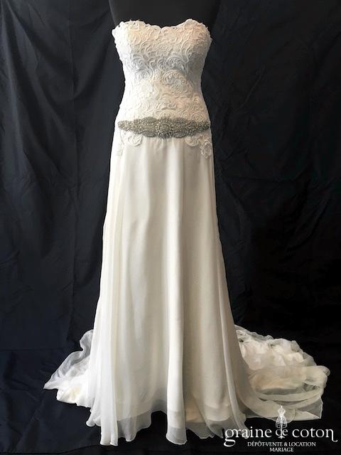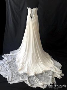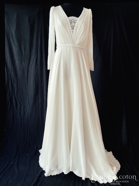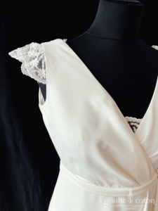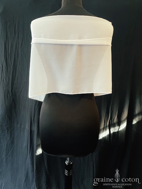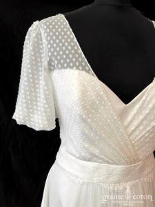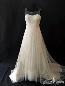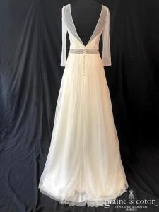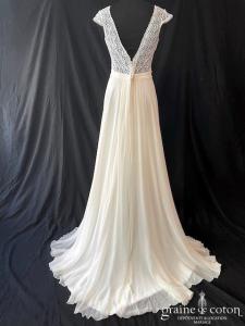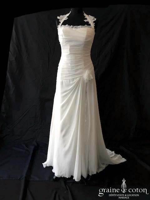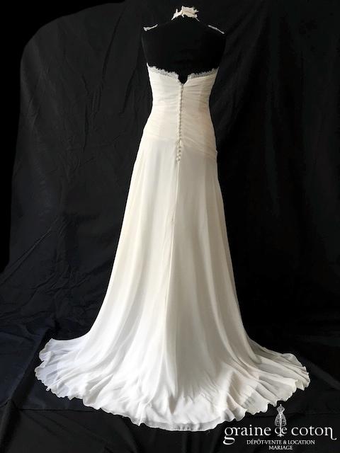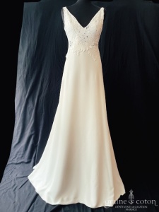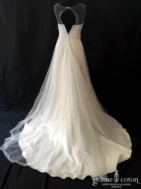 Robe une pièce ivoire clair : top en V drapé de tulle, effet cache coeur. Bretelles avec voile de tulle pour le smanchhes et dos nu. Jupe taille haute marquée …