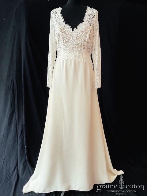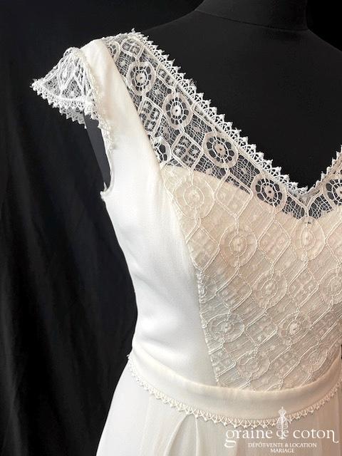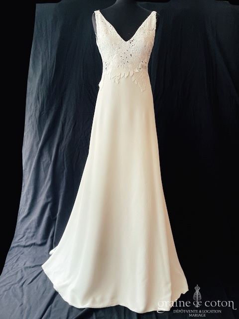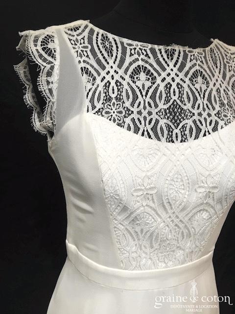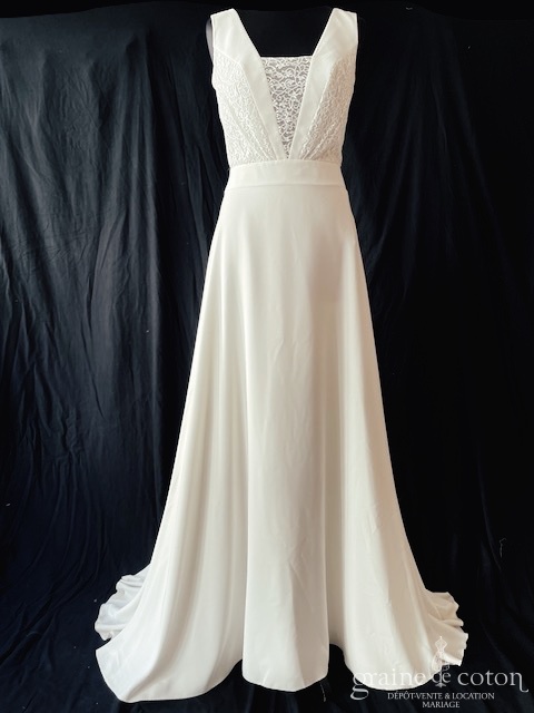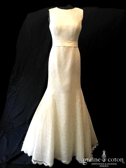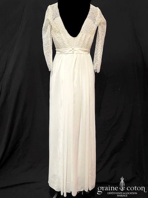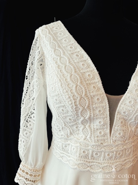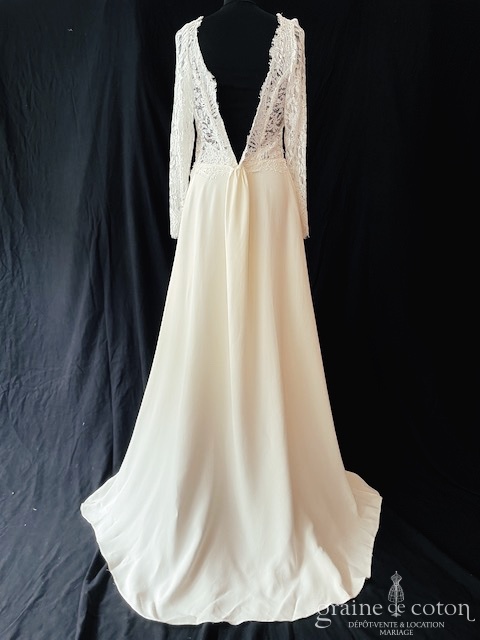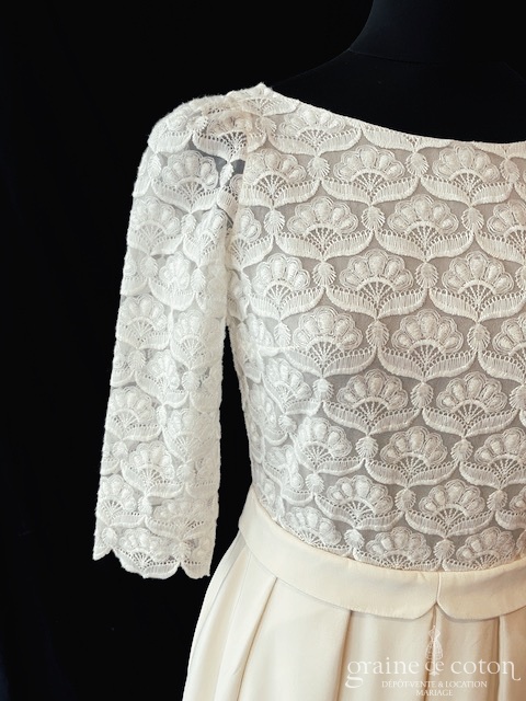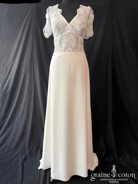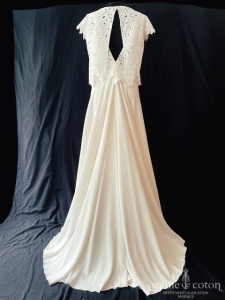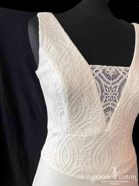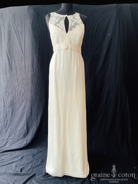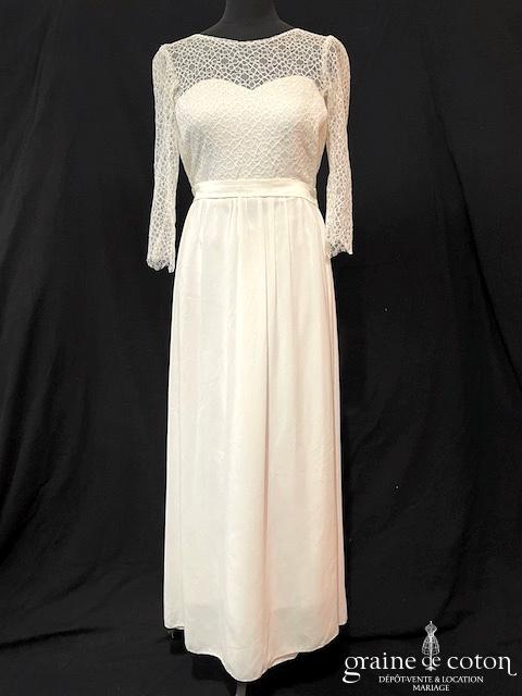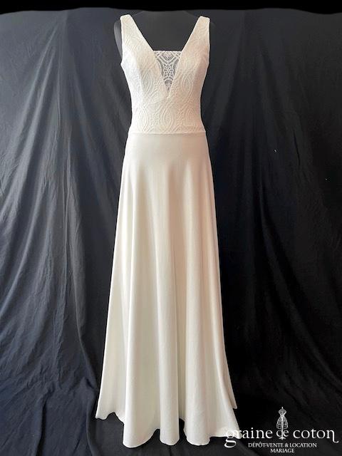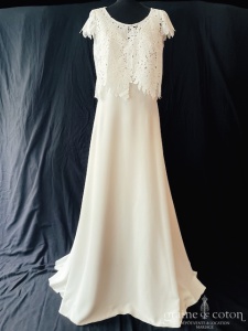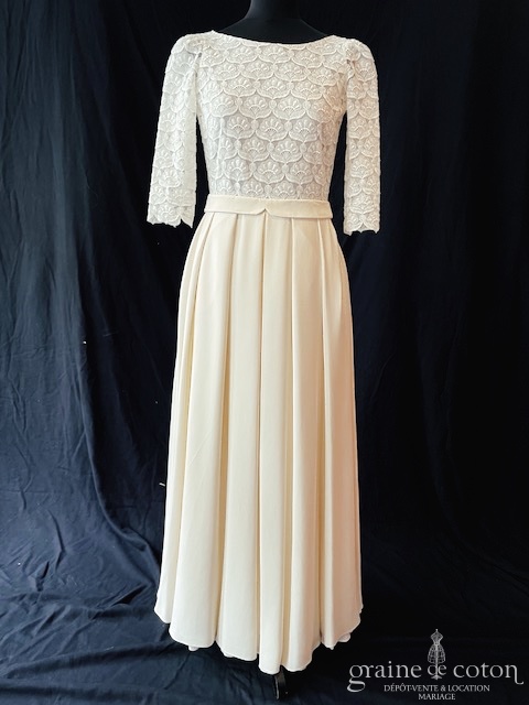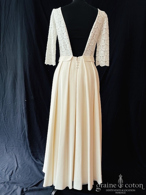Robe une pièce ivoire clair : top en guipure avec manches 3/4 et dos nu géométrique. Jupe légèrement fourreau taille haute en crêpe épurée, évasée avec traîne. Chic, champêtre et …