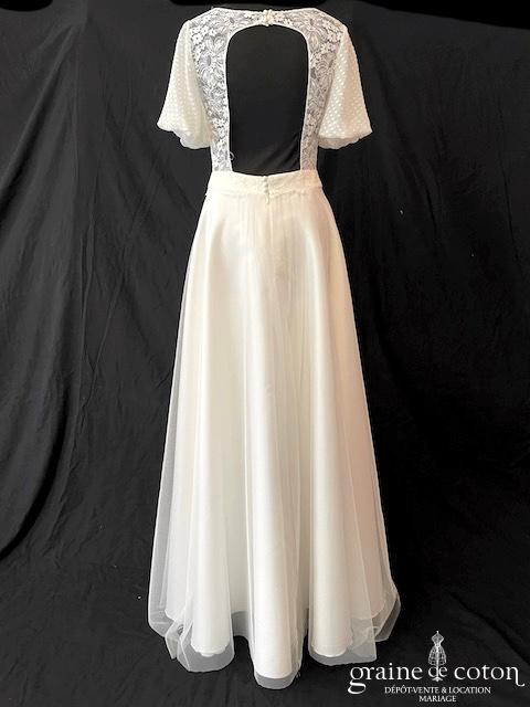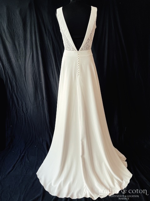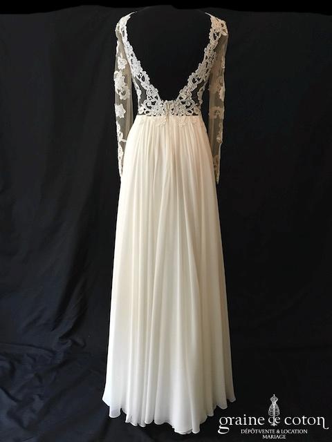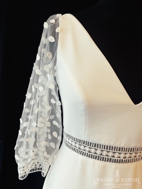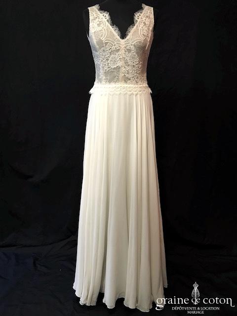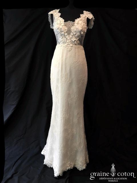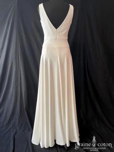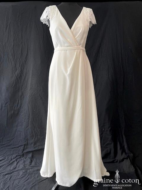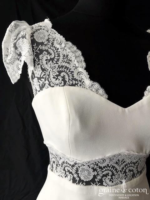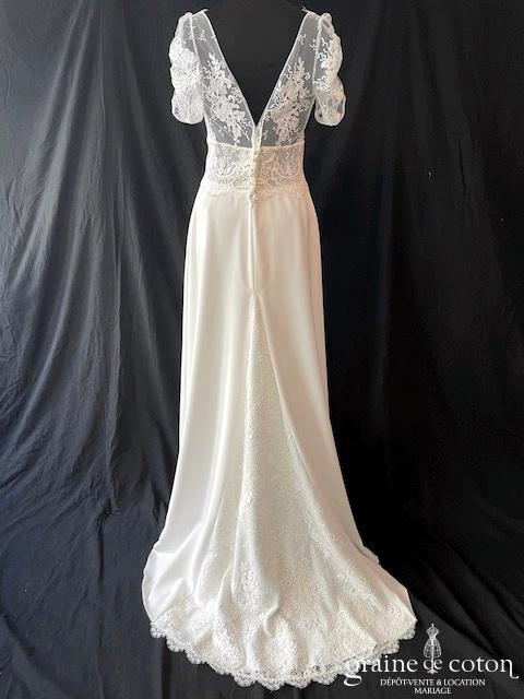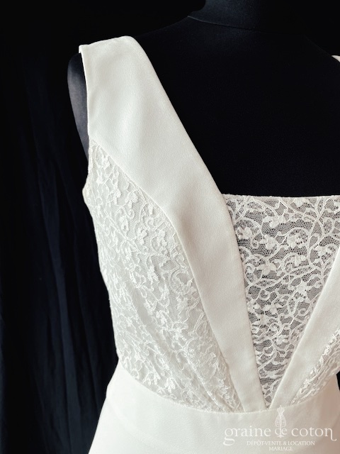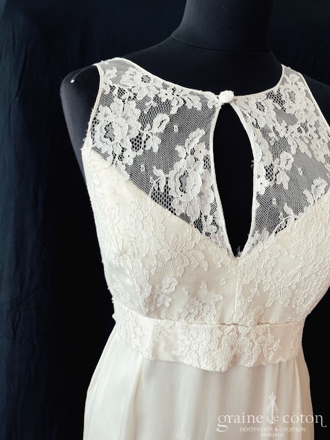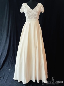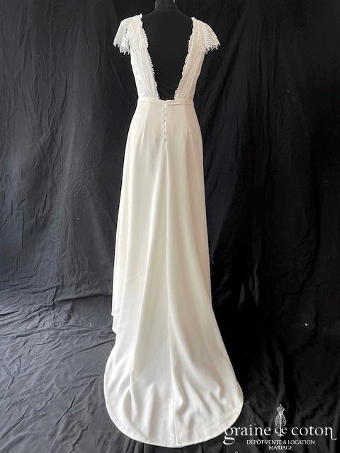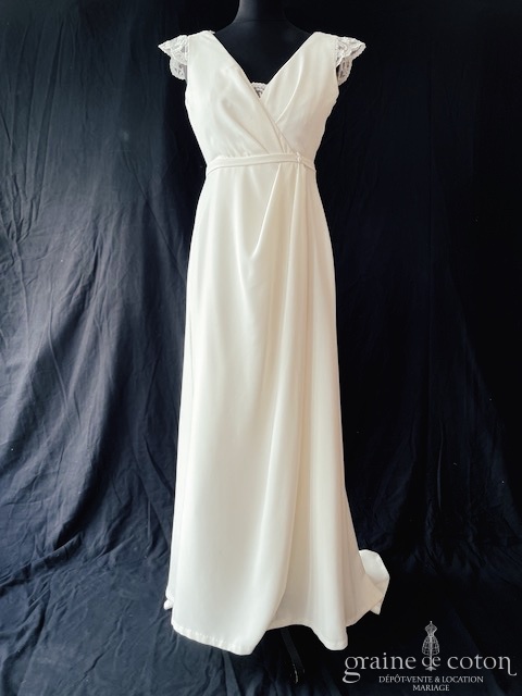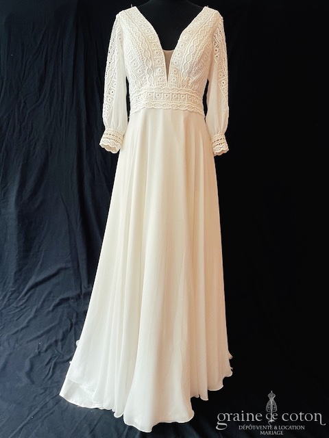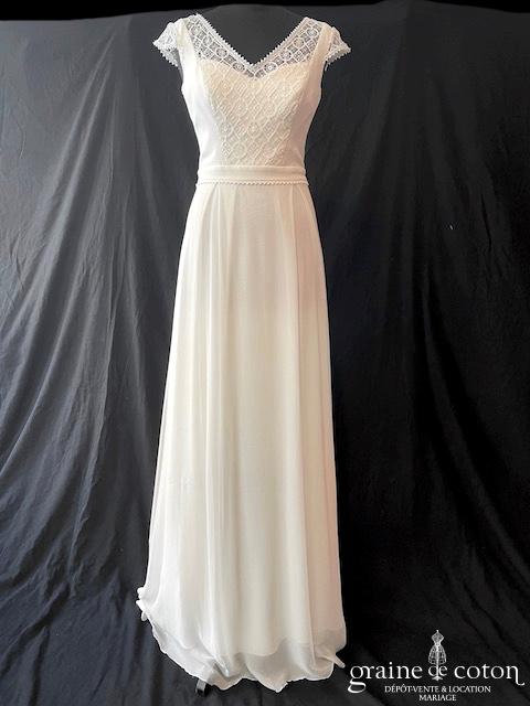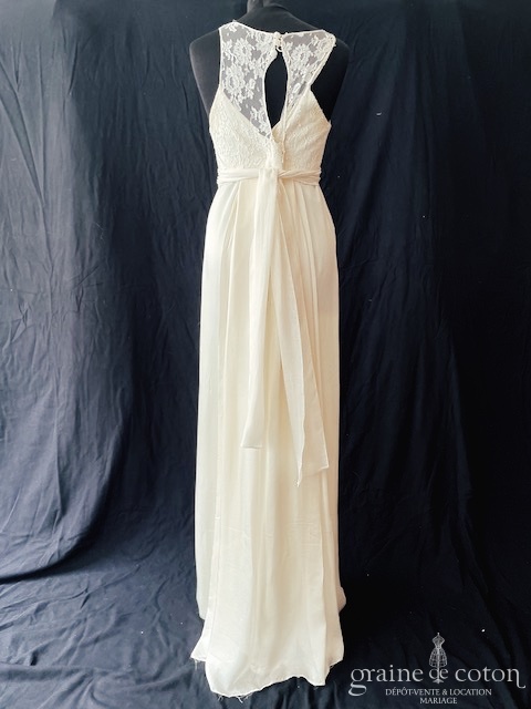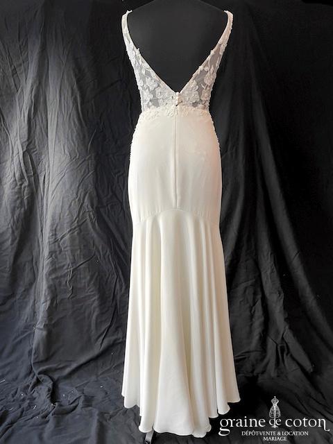 Robe une pièce ivoire clair : top en guipure avec manches 3/4 et dos nu géométrique. Jupe légèrement fourreau taille haute en crêpe épurée, évasée avec traîne. Chic, champêtre et …