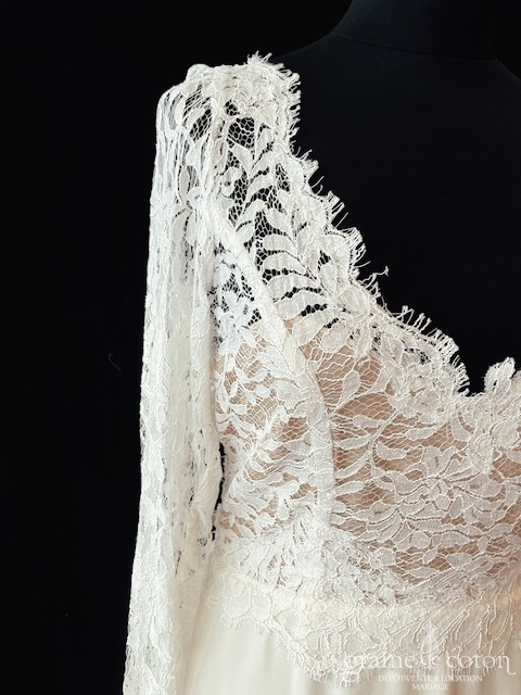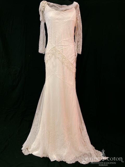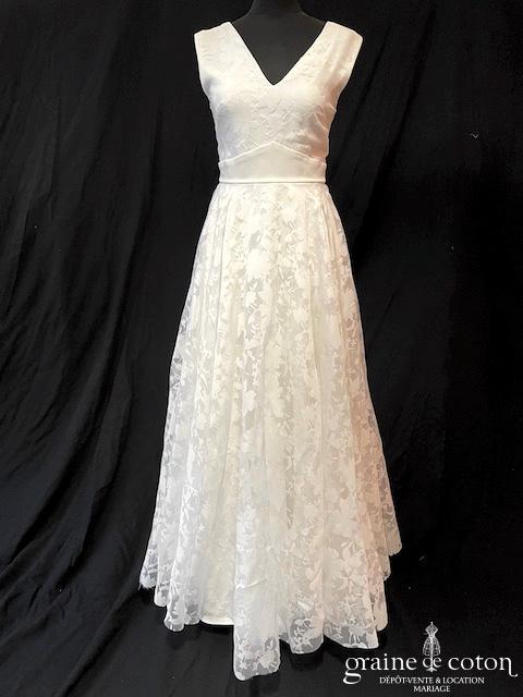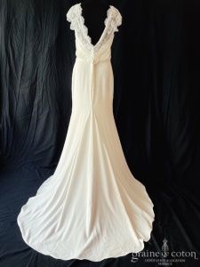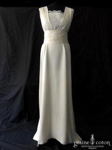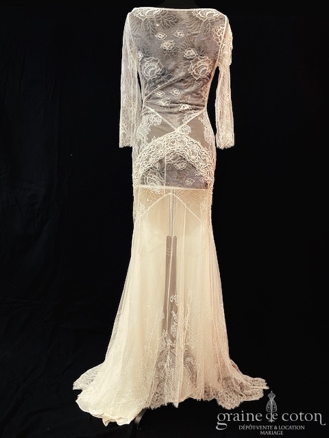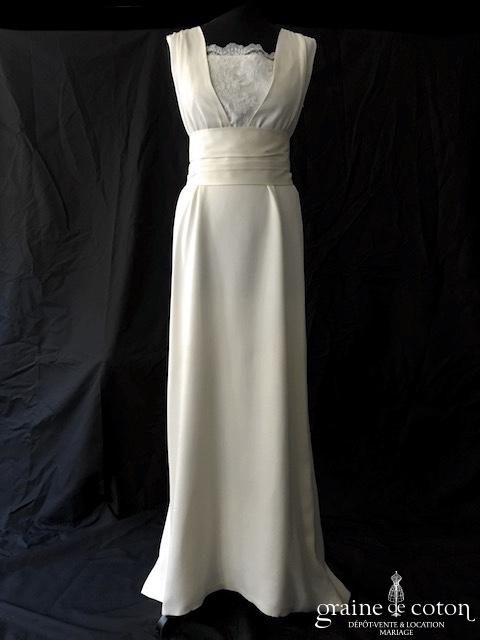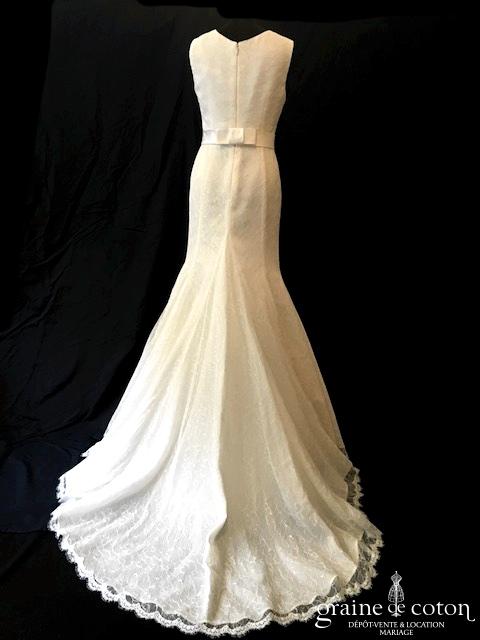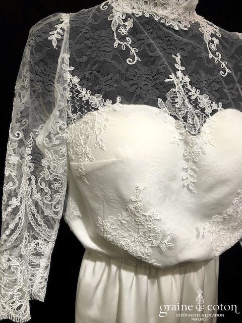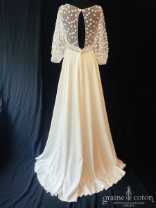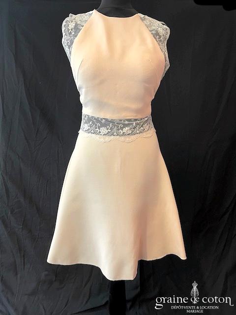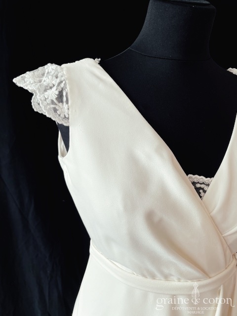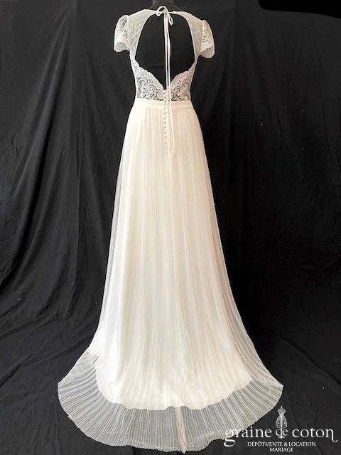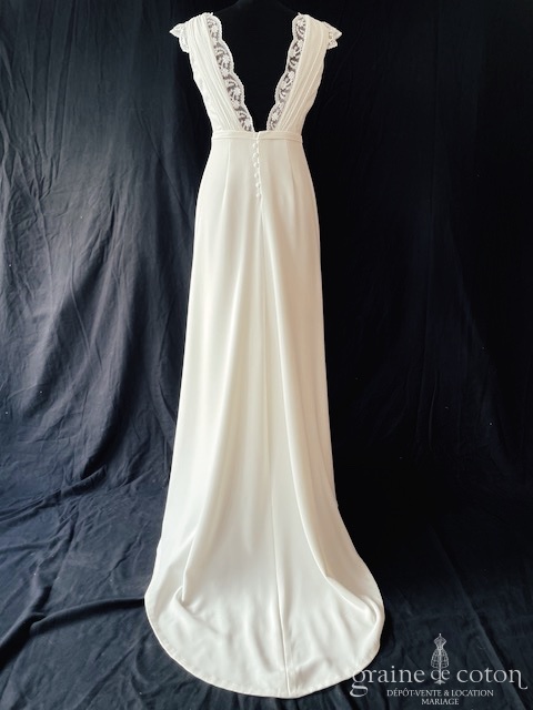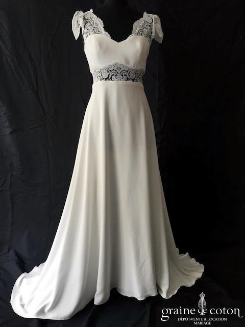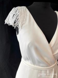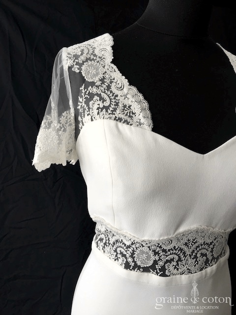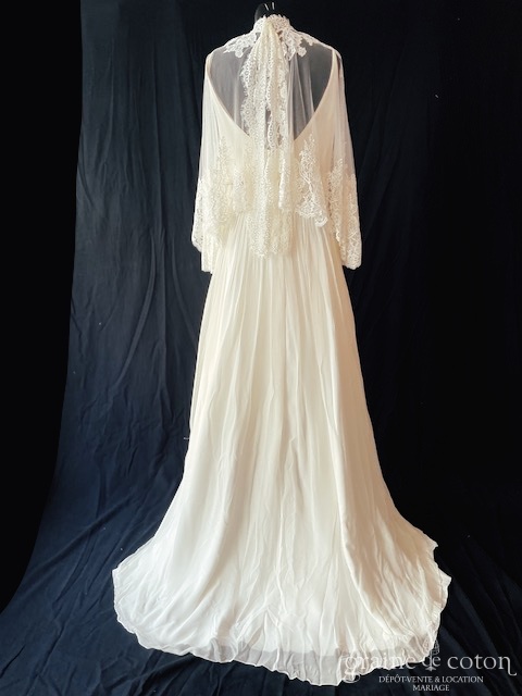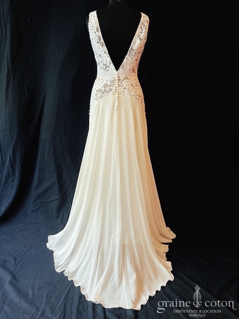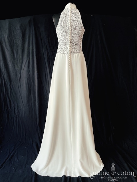 Robe une pièce ivoire clair : top en guipure avec manches 3/4 et dos nu géométrique. Jupe légèrement fourreau taille haute en crêpe épurée, évasée avec traîne. Chic, champêtre et …