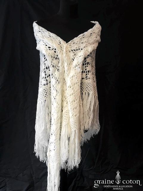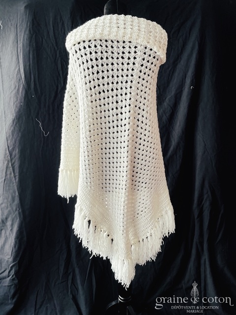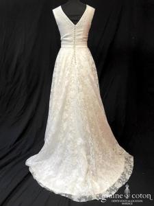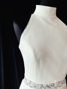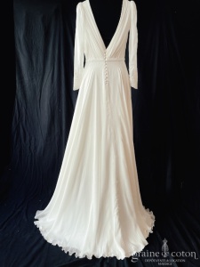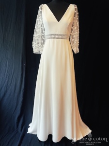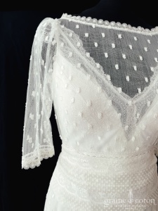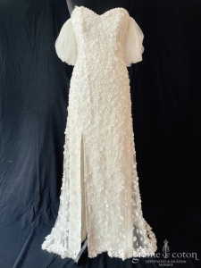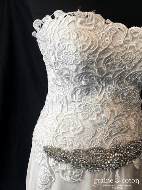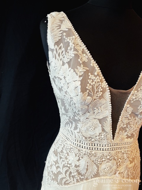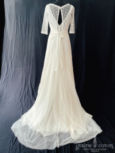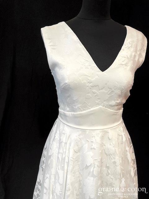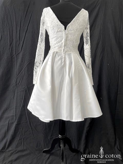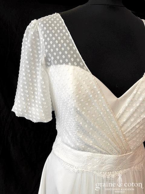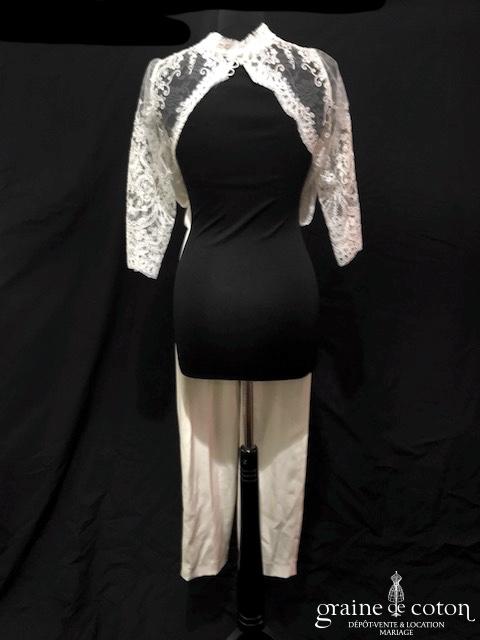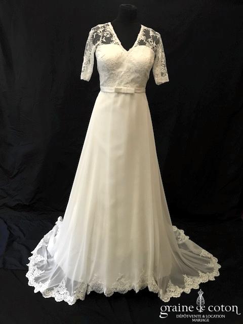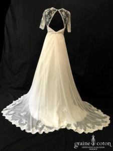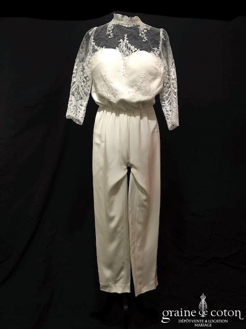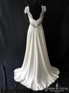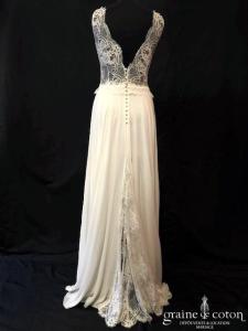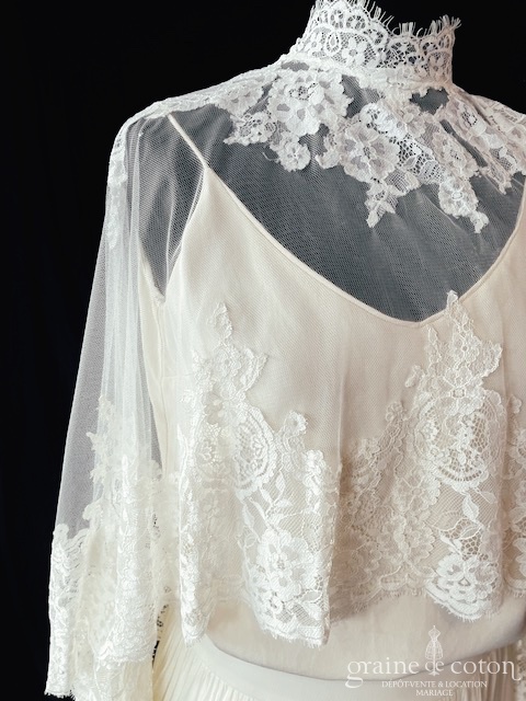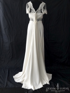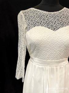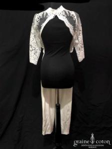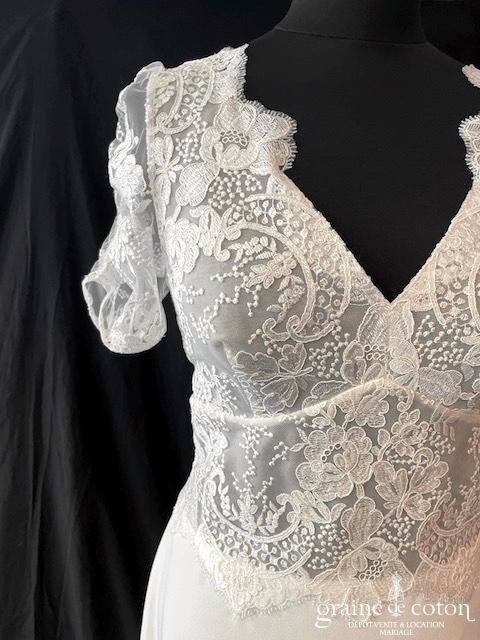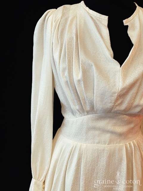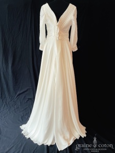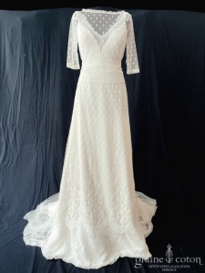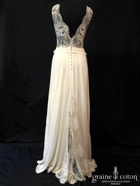 Robe une pièce ivoire clair : top en guipure avec manches 3/4 et dos nu géométrique. Jupe légèrement fourreau taille haute en crêpe épurée, évasée avec traîne. Chic, champêtre et …