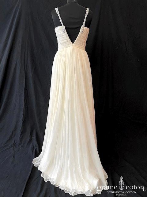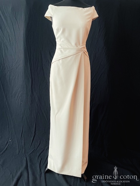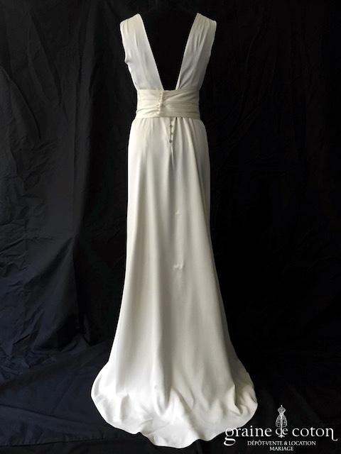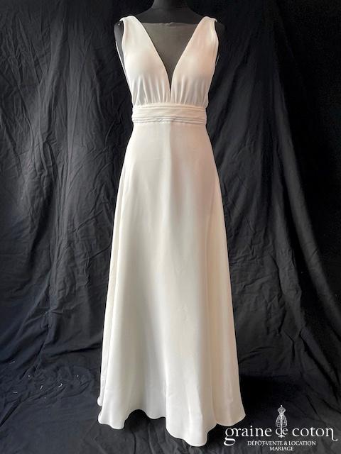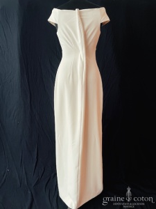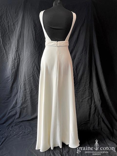 Robe une pièce en crêpe ivoire clair : top encolure américaine et dos nu. Jupe taille haute fluide et épurée, tombé fourreau, fente sur le côté et petite traîne. Chic, …