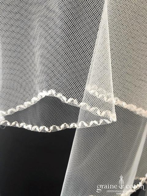 Voile long de 300 cm en tulle souple ivoire clair bordé de perles. Monté sur peigne, sans rabat.