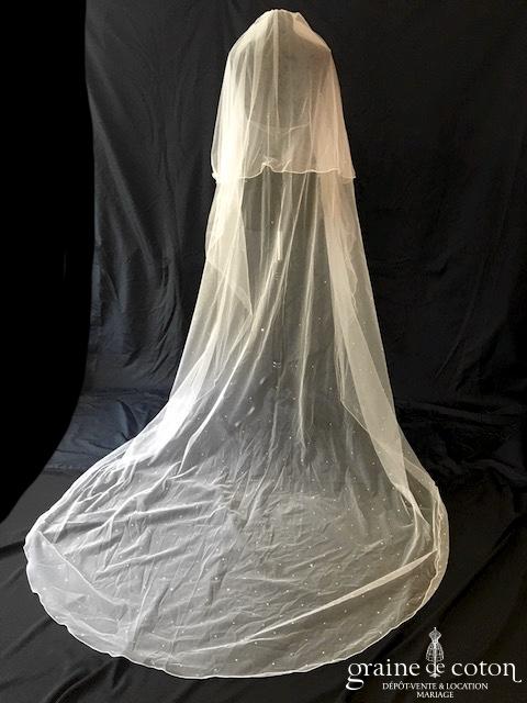 Création – Voile long de 300 cm en tulle ivoire clair bordé de perles