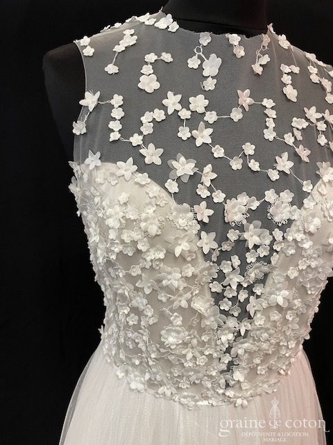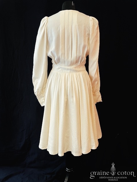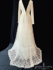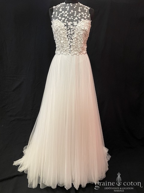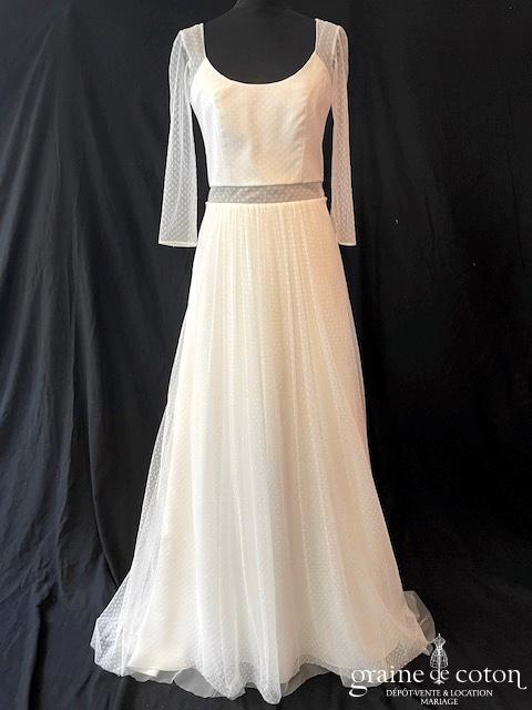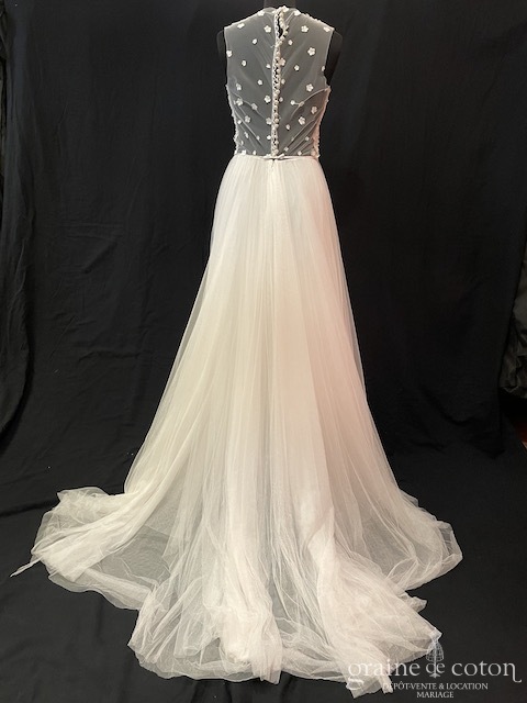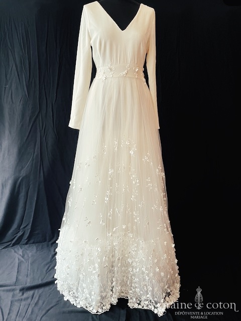 Robe une pièce ivoire clair : top décolleté en V en crêpe avec manches longues, dos en tulle transparent entièrement boutonné. Jupe midi taille haute en tulle, coupe patineuse. Idéale …
