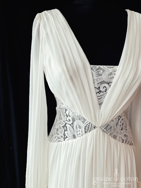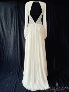 Robe une pièce ivoire clair : top à manches longues en mousseline, empiècements de dentelle sur les côtés et encolure V, dos nu. Jupe taille haute en mousseline fluide drapée, …