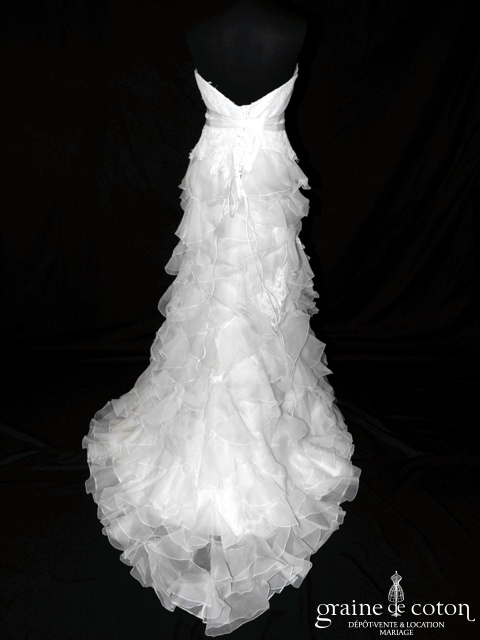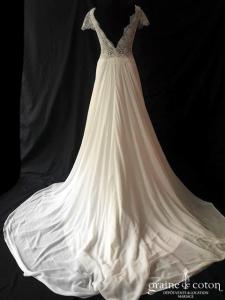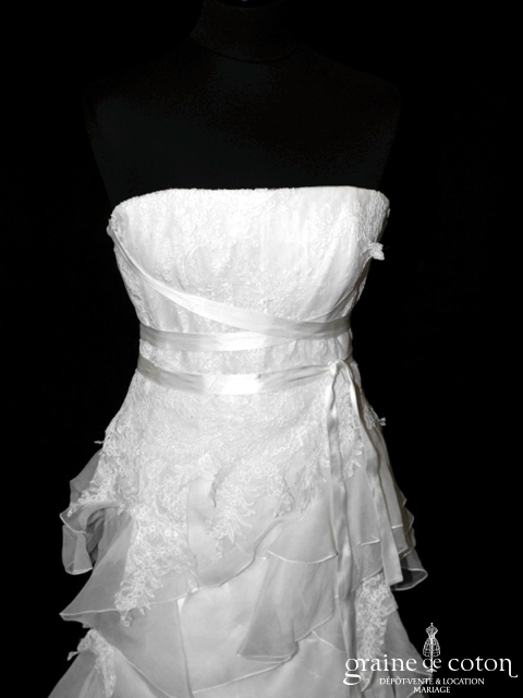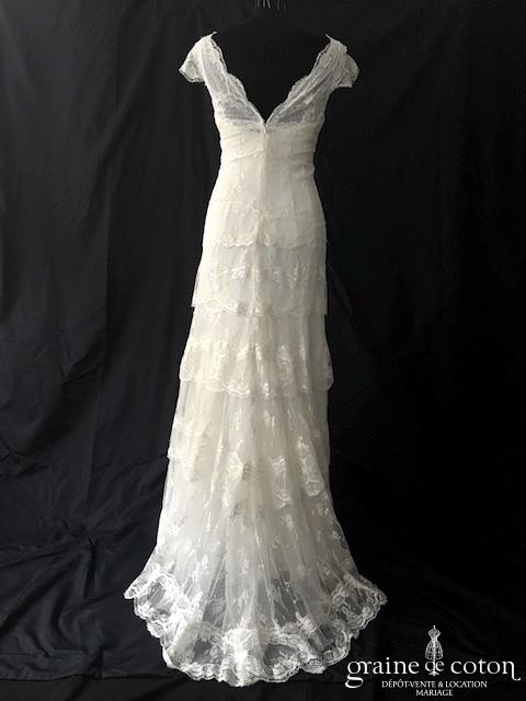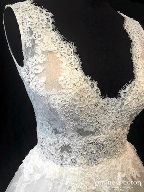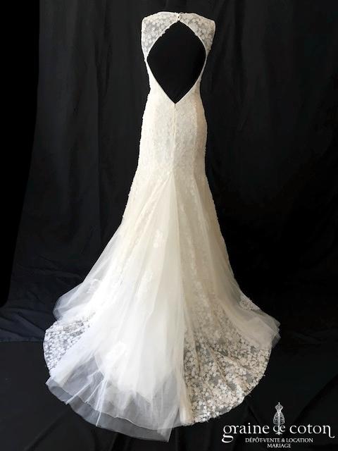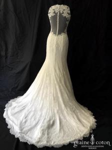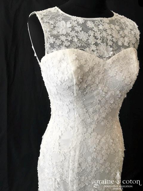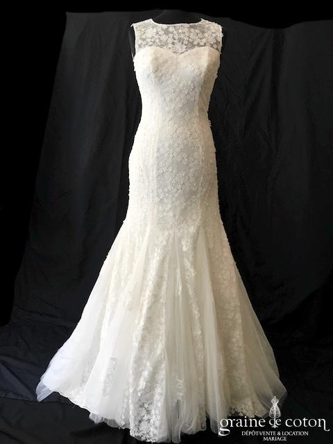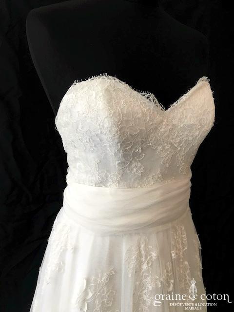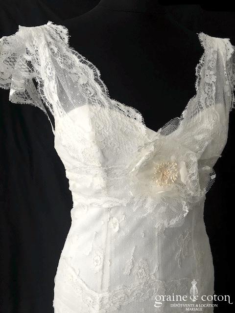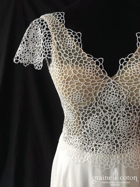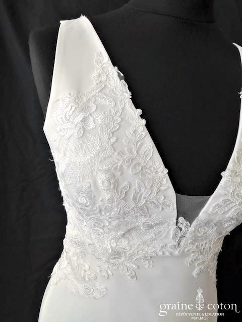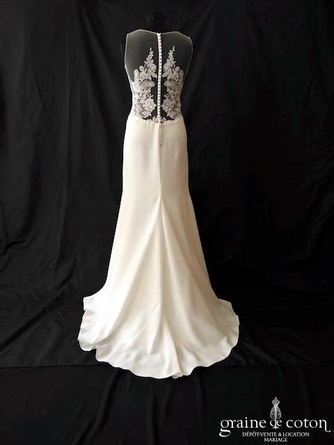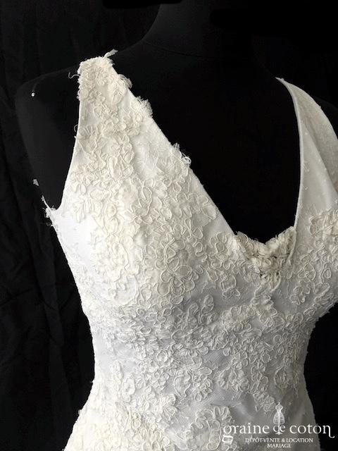 Robe une pièce ivoire clair : top en dentelle encolure en V, dos entièrement boutonné. Large empiècement à la taille. Jupe taille haute en mikado, évasée avec longue traîne et …