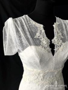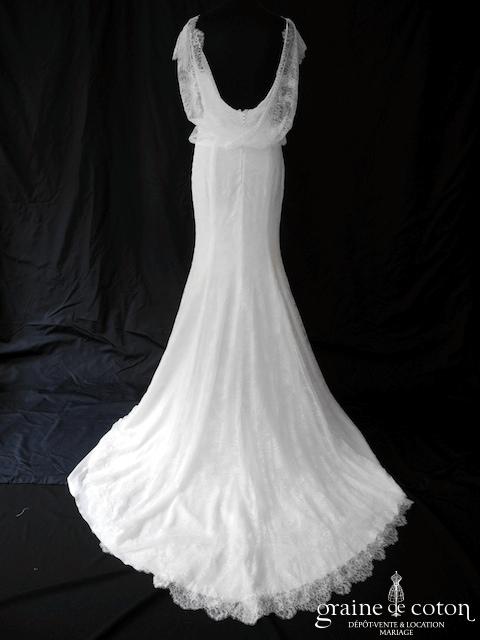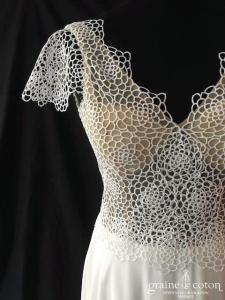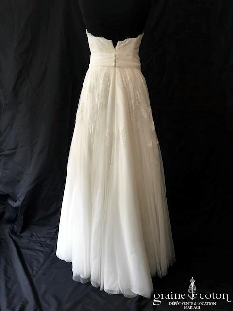 Robe une pièce ivoire clair : top en dentelle de Calais décolleté V, dos nu en V, petites manches. Jupe taille haute marquée par une ceinture drapée, en tulle fluide, …