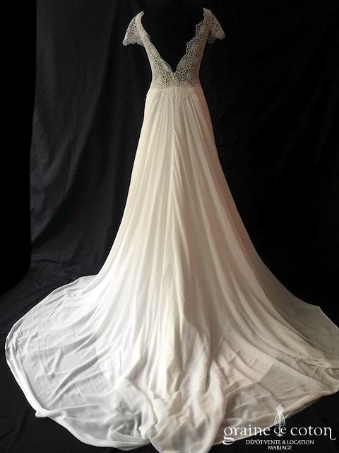 Robe une pièce tout en mousseline fluide ivoire clair : décolleté V cache coeur drapé et dos nu. Jupe taille haute épurée avec petite traîne. Sobre, élégante et délicate.