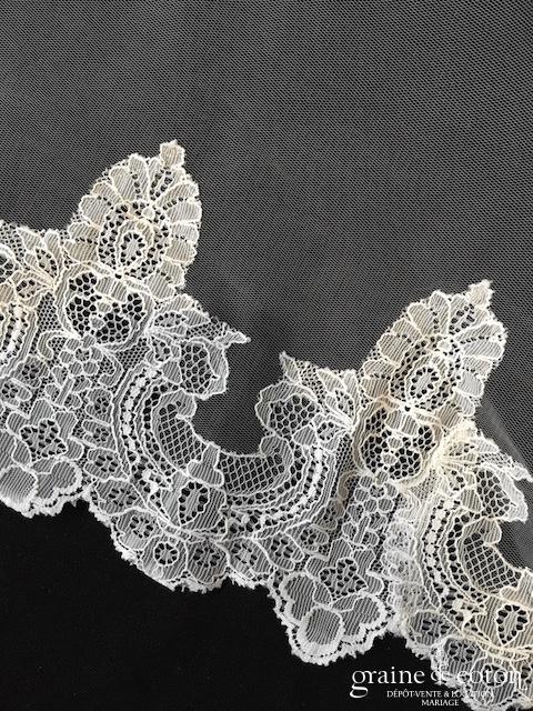 Voile long de 200 cm en tulle fluide bordé de pétales en organza et dentelle de Chantilly. Non monté sur peigne, peut donc se porter avec ou sans rabat.