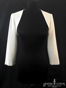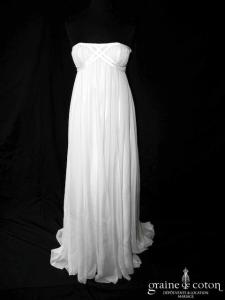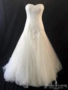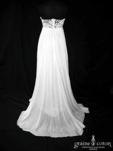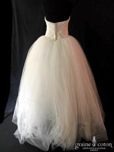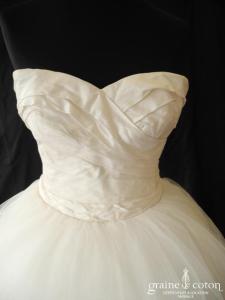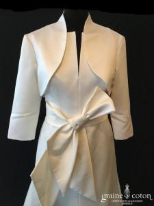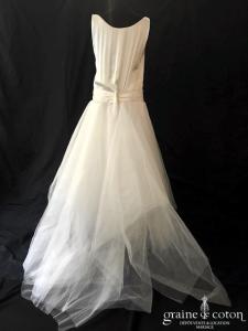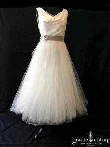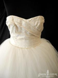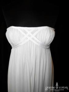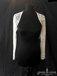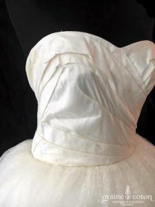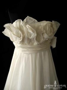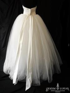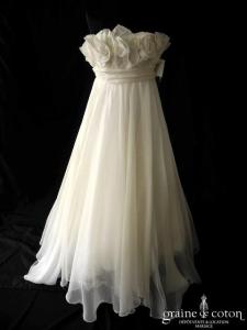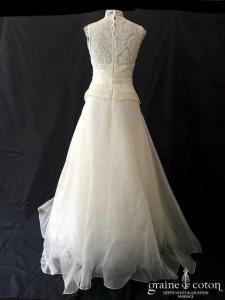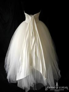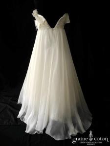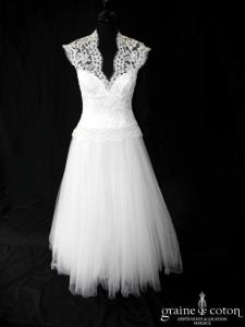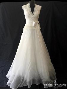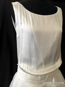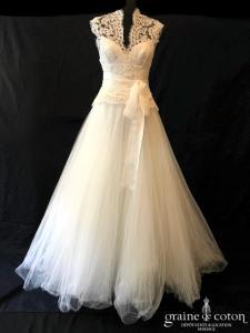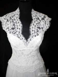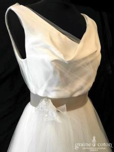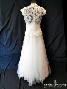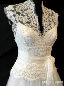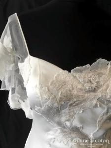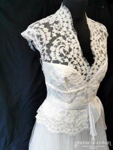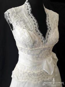 Robe une pièce ivoire : bustier tout en dentelle de calais, larges bretelles façon manches, décolleté en V. Ceinture à la taille qui peut être retirée. Jupe taille basse en …