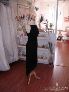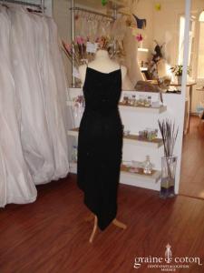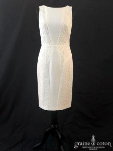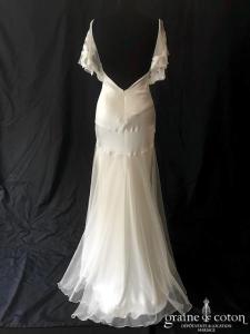Robe deux pièces : sous robe en soie écrue extra fluide avec fines bretelles, coupe fourreau. Sur robe en fine dentelle délicatement perlée à la main, avec manches 3/4, encolure …