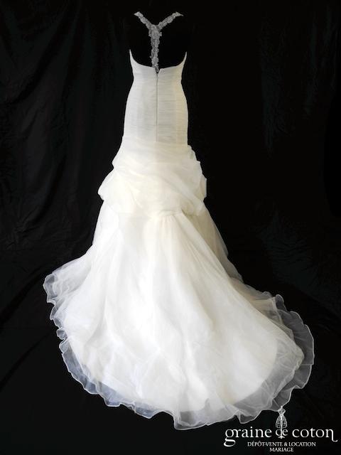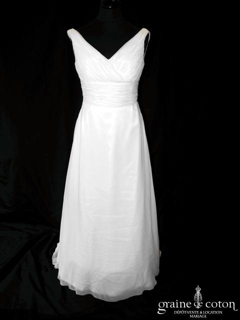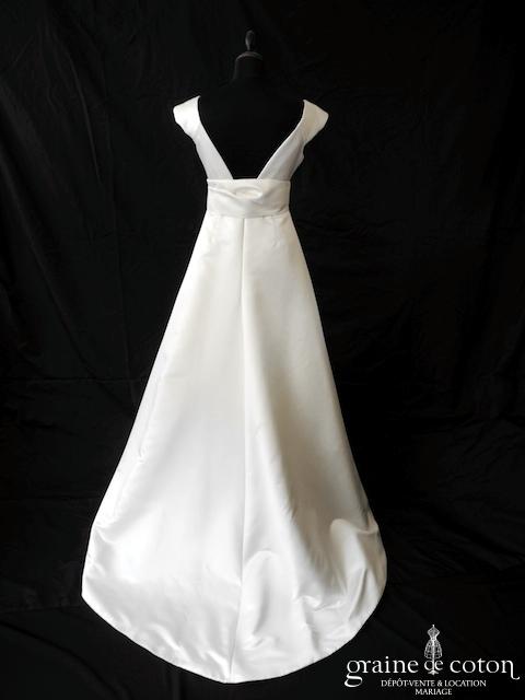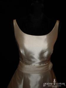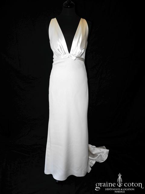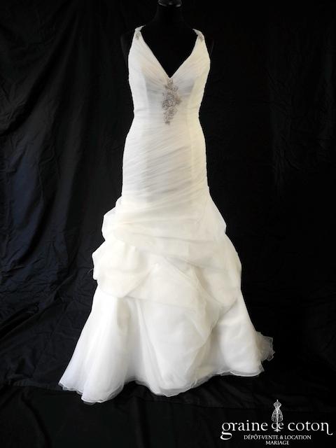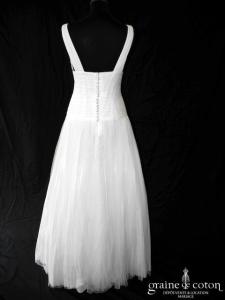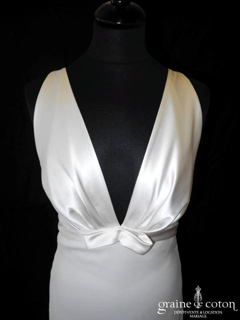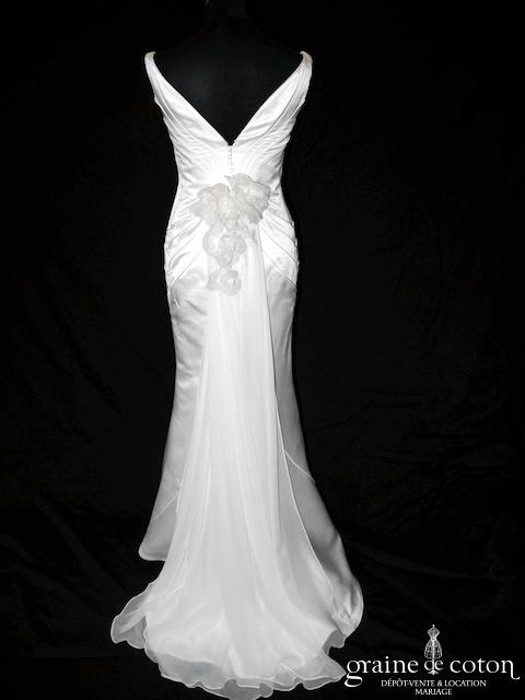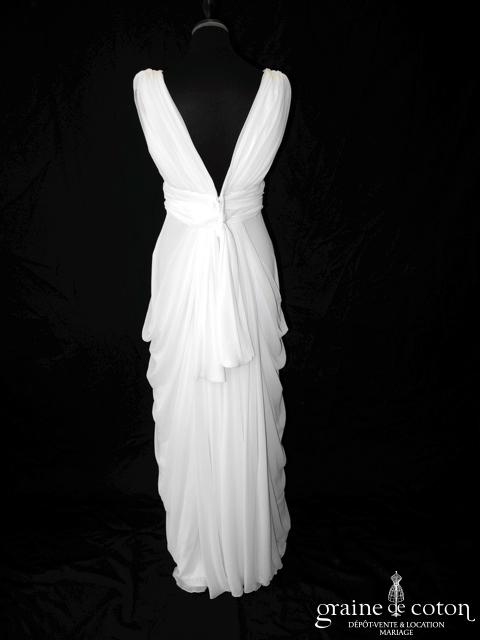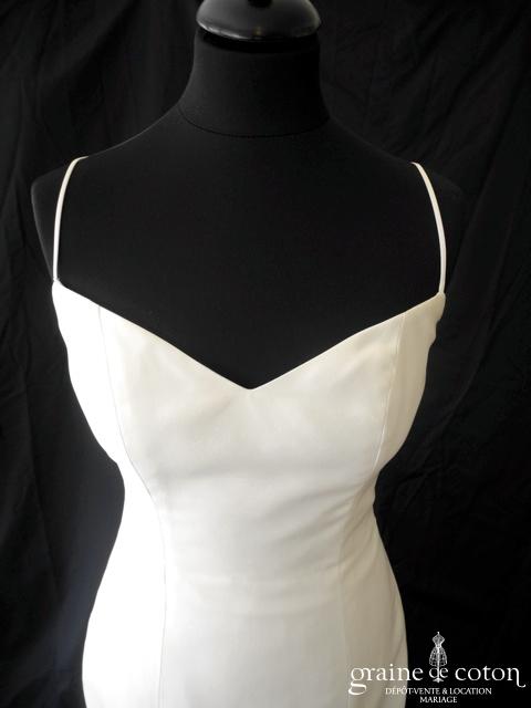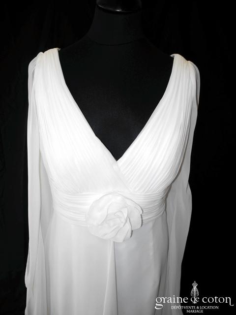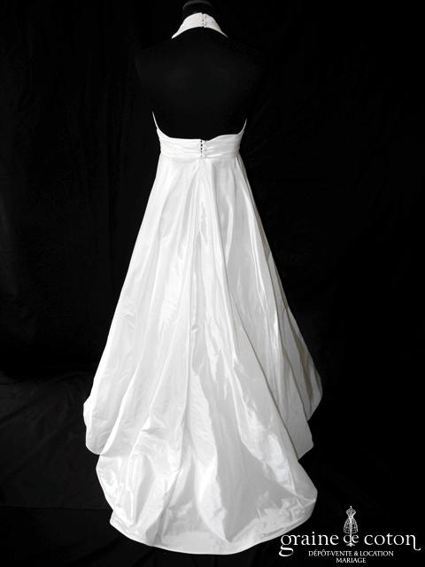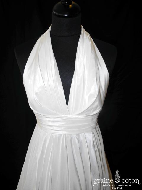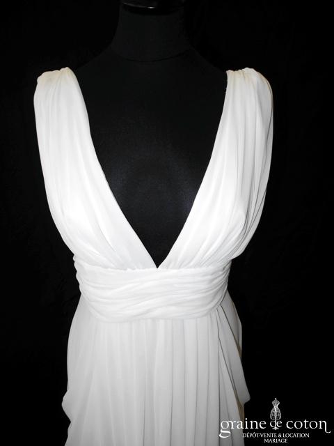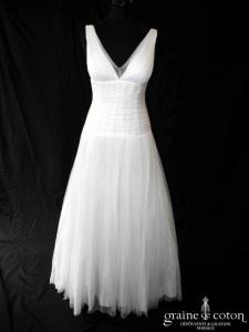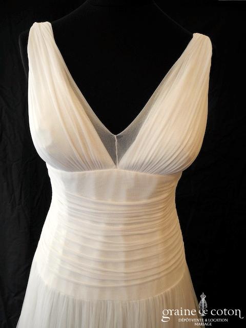 Robe une pièce en soie sauvage blanc drapée de tulle de soie ivoire. Bustier empire avec bretelles formant un décolleté en V, drapé à la taille. Jupe taille basse avec …
