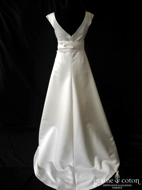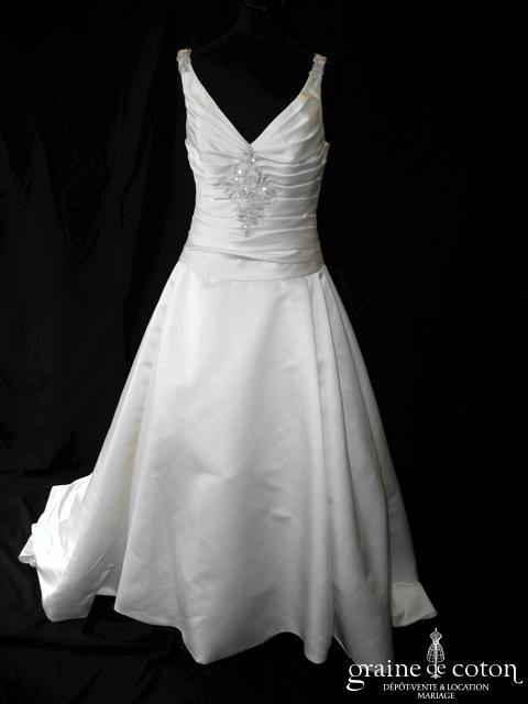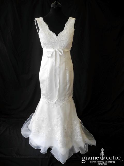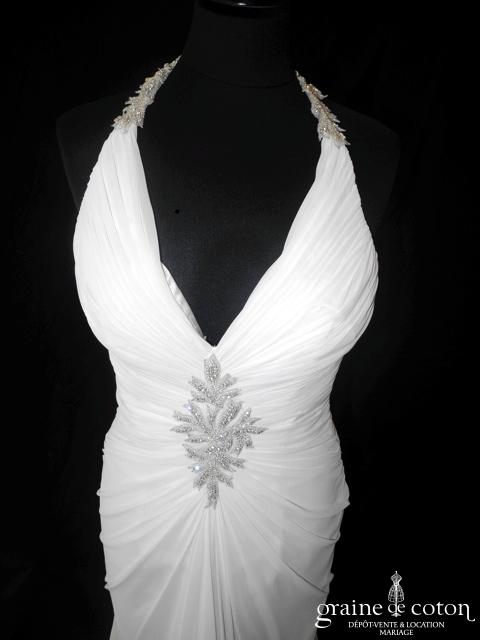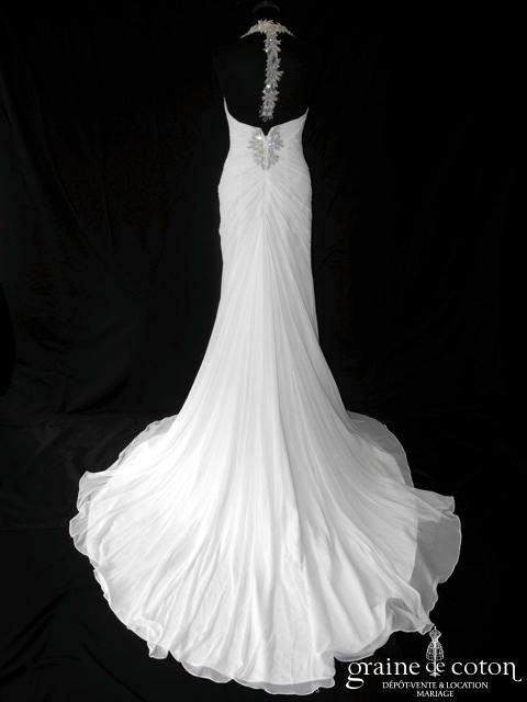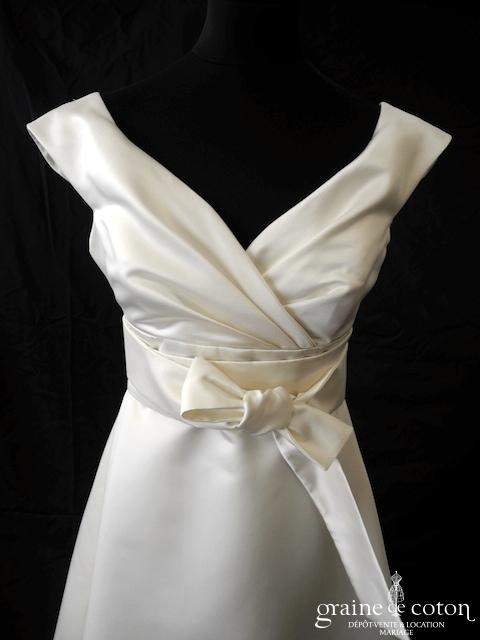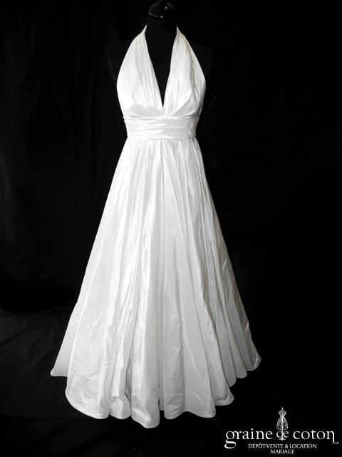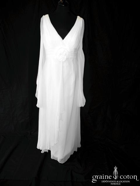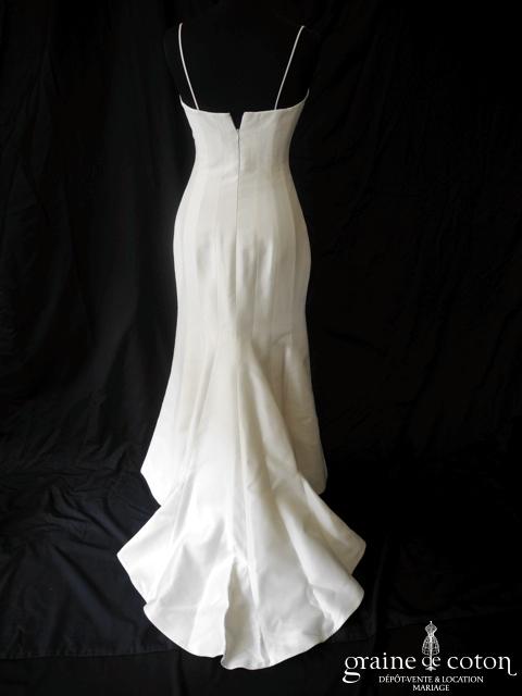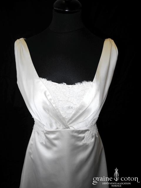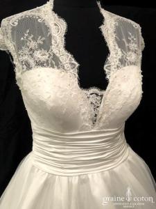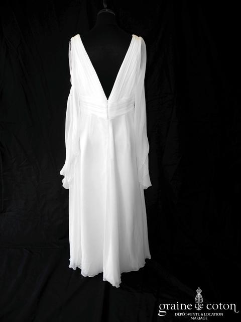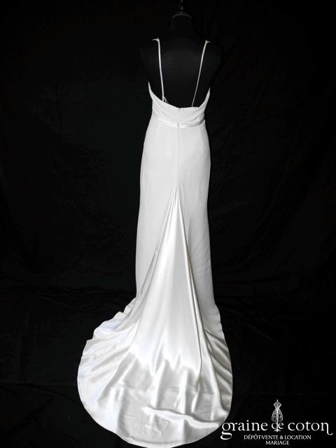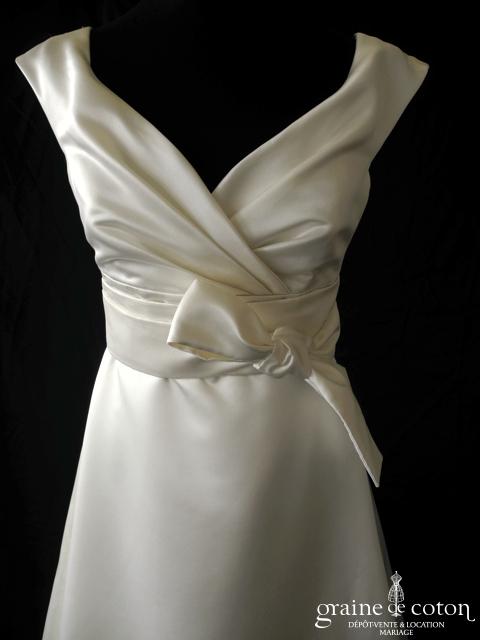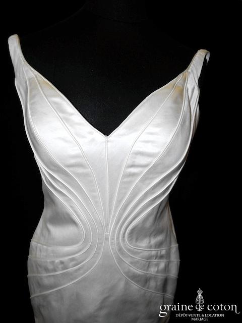 Robe une pièce en soie sauvage blanc drapée de tulle de soie ivoire. Bustier empire avec bretelles formant un décolleté en V, drapé à la taille. Jupe taille basse avec …